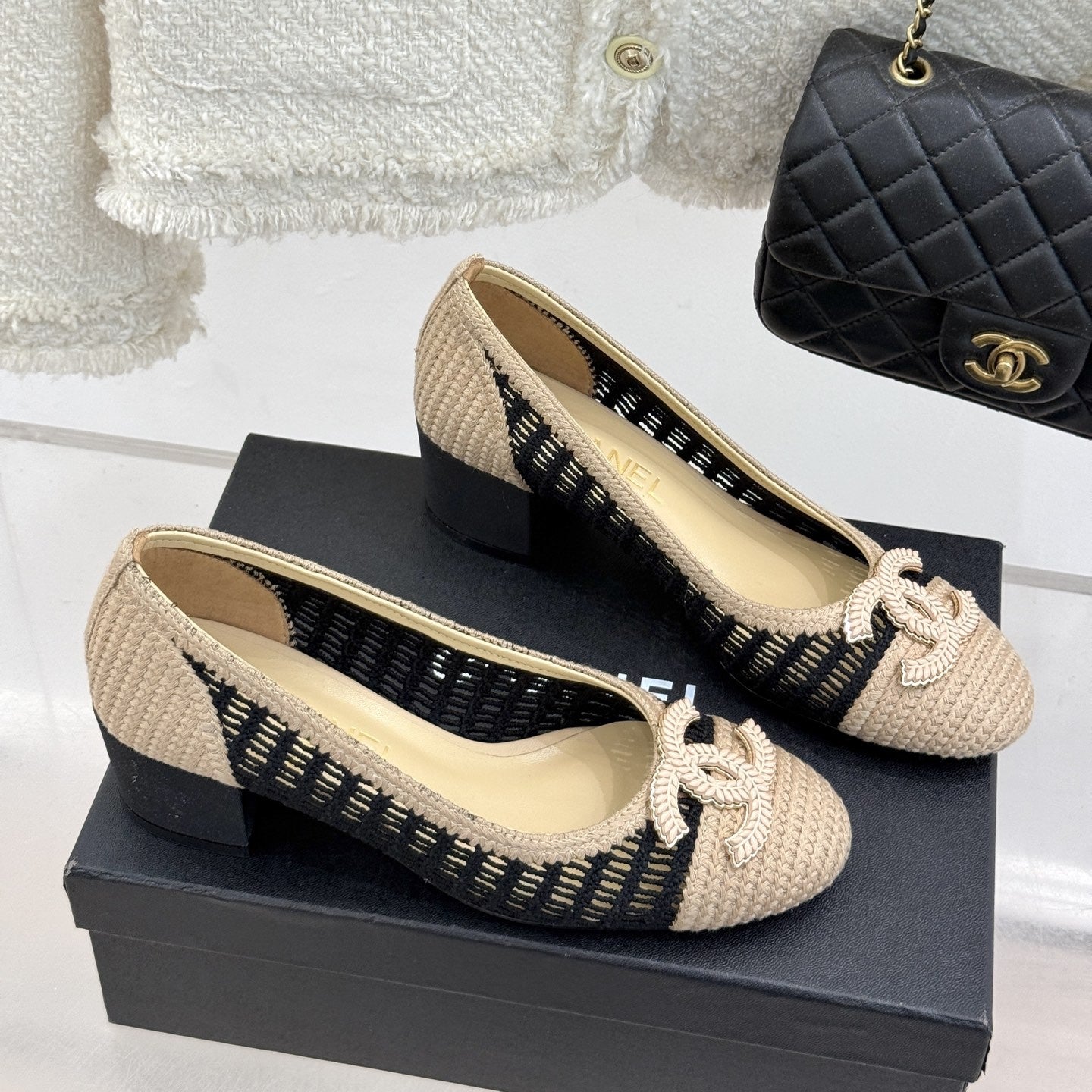 CC 25P Hollow Double C Ballet Flats 50mm Beige Black Raffia 265636