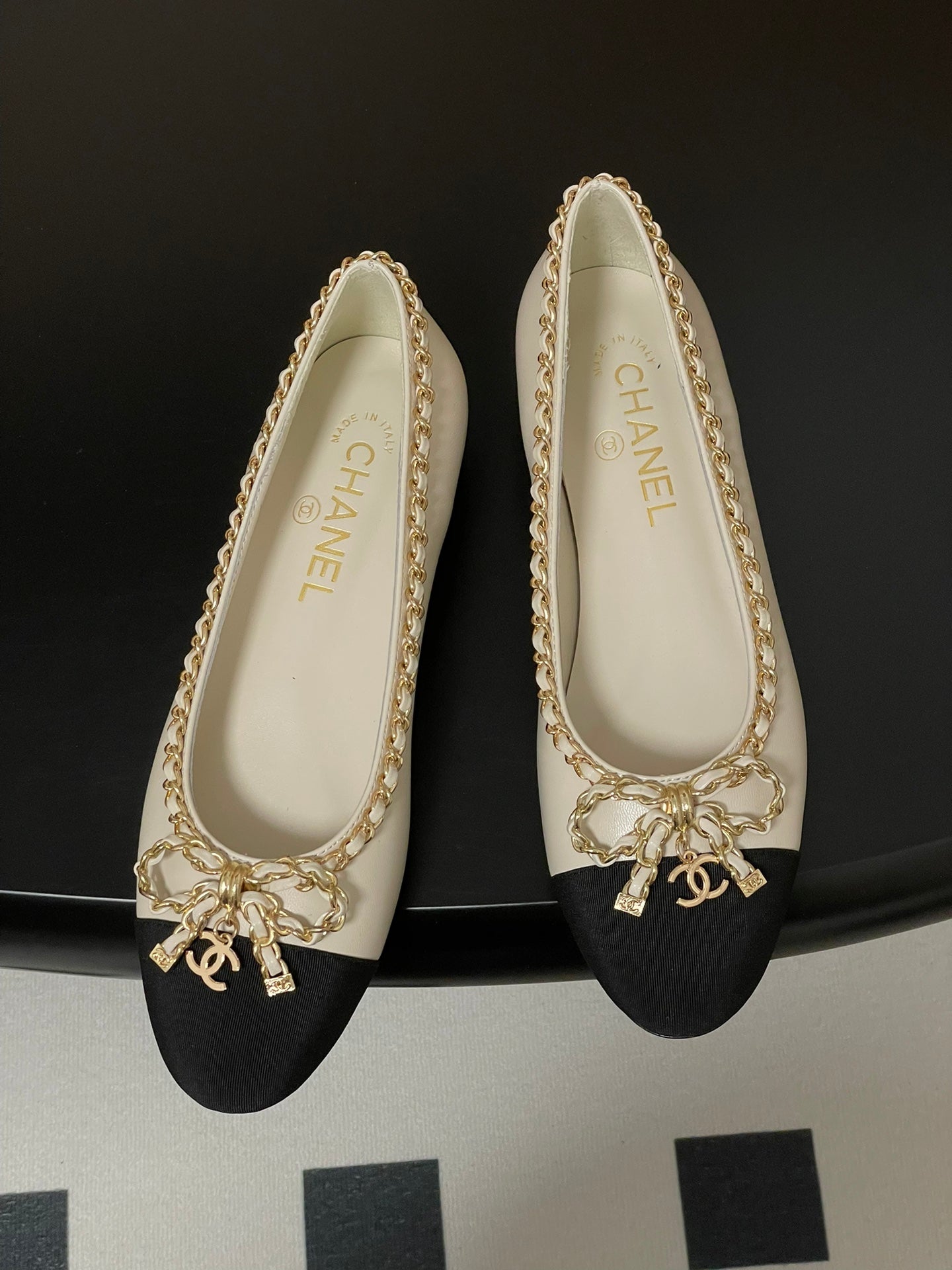 CC 25S 20mm Chain Bow Single Flat White Sheepskin Black Grosgrain 247655