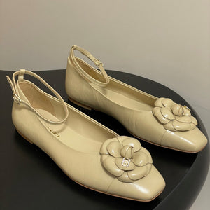 CC Logo Bow with Camellia Ballerina Flats Black Beige Cowhide Sheepskin 427020