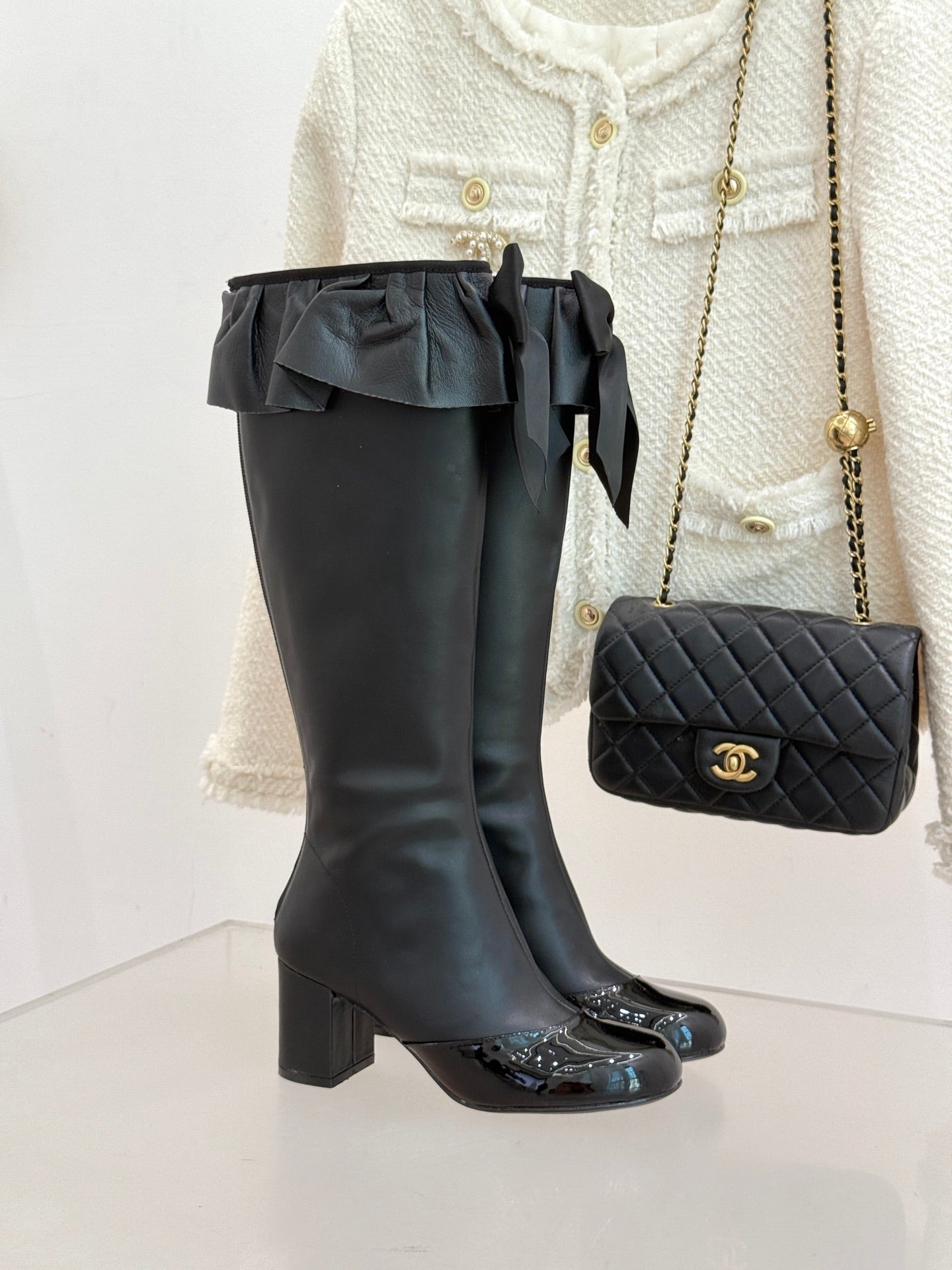 CC 25A Pleated-Collar Bow-Tie Stretch High Boots Black Lambskin 473359