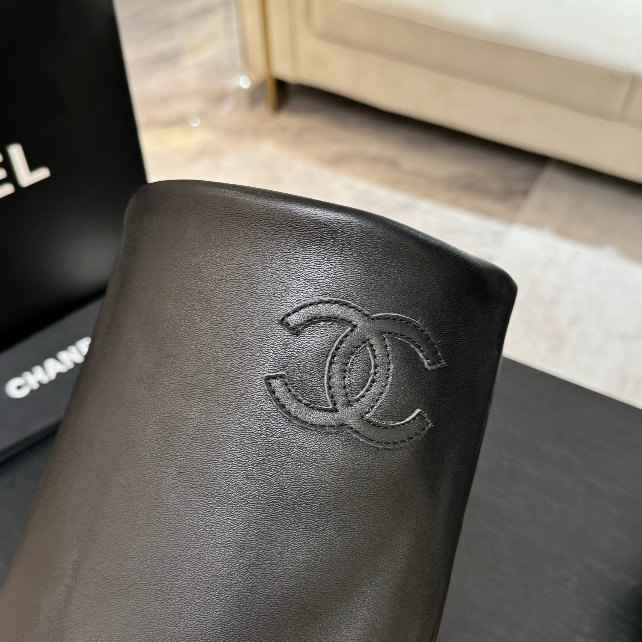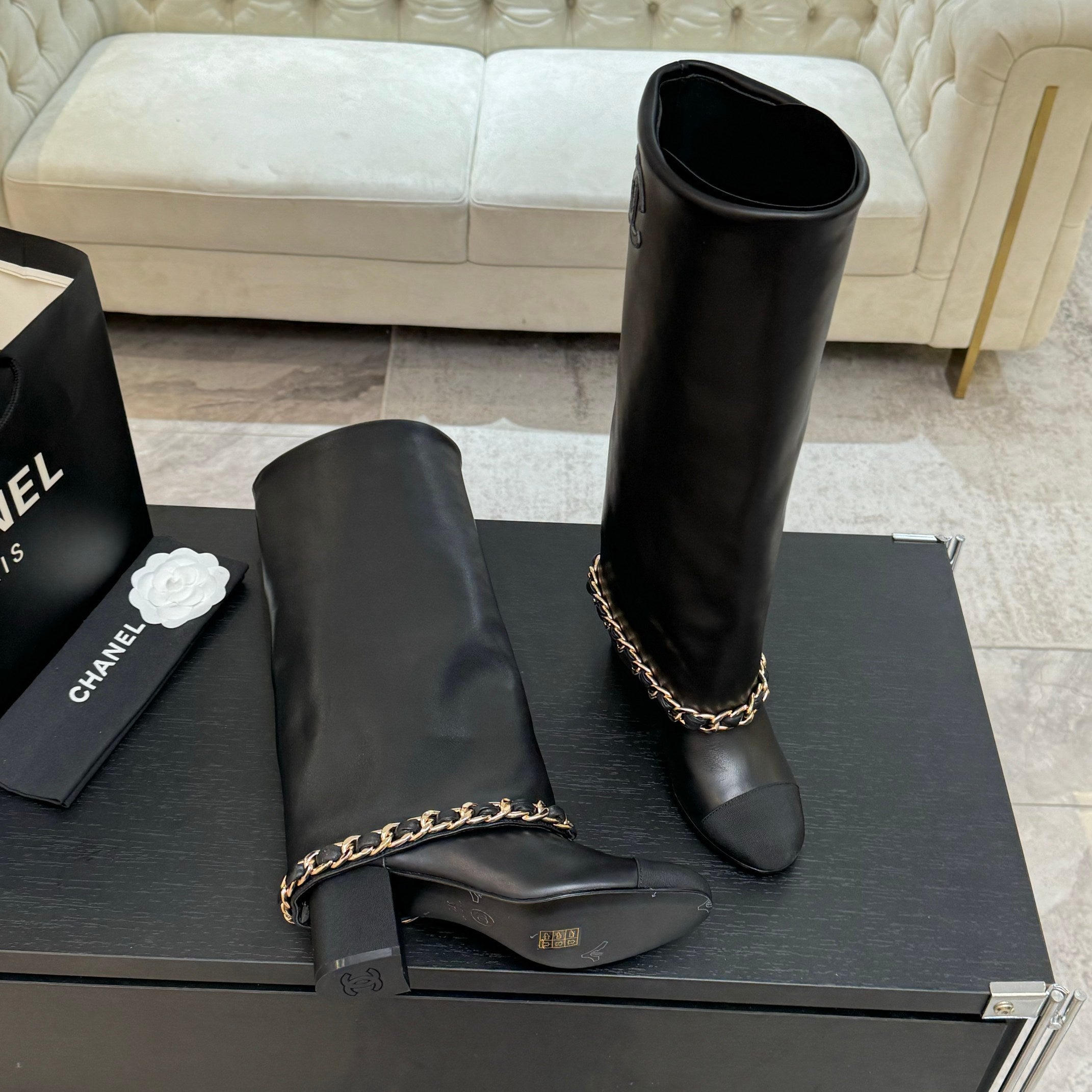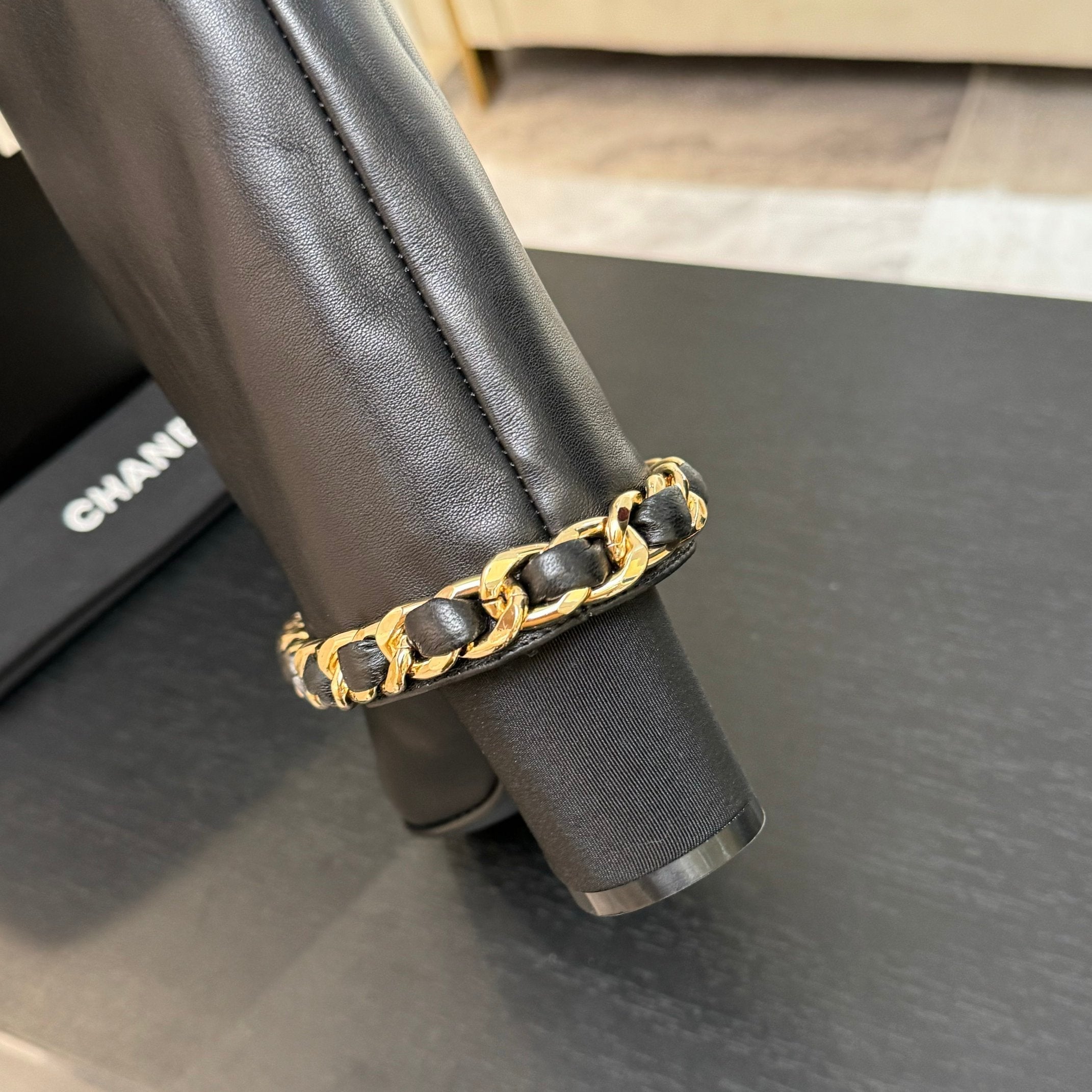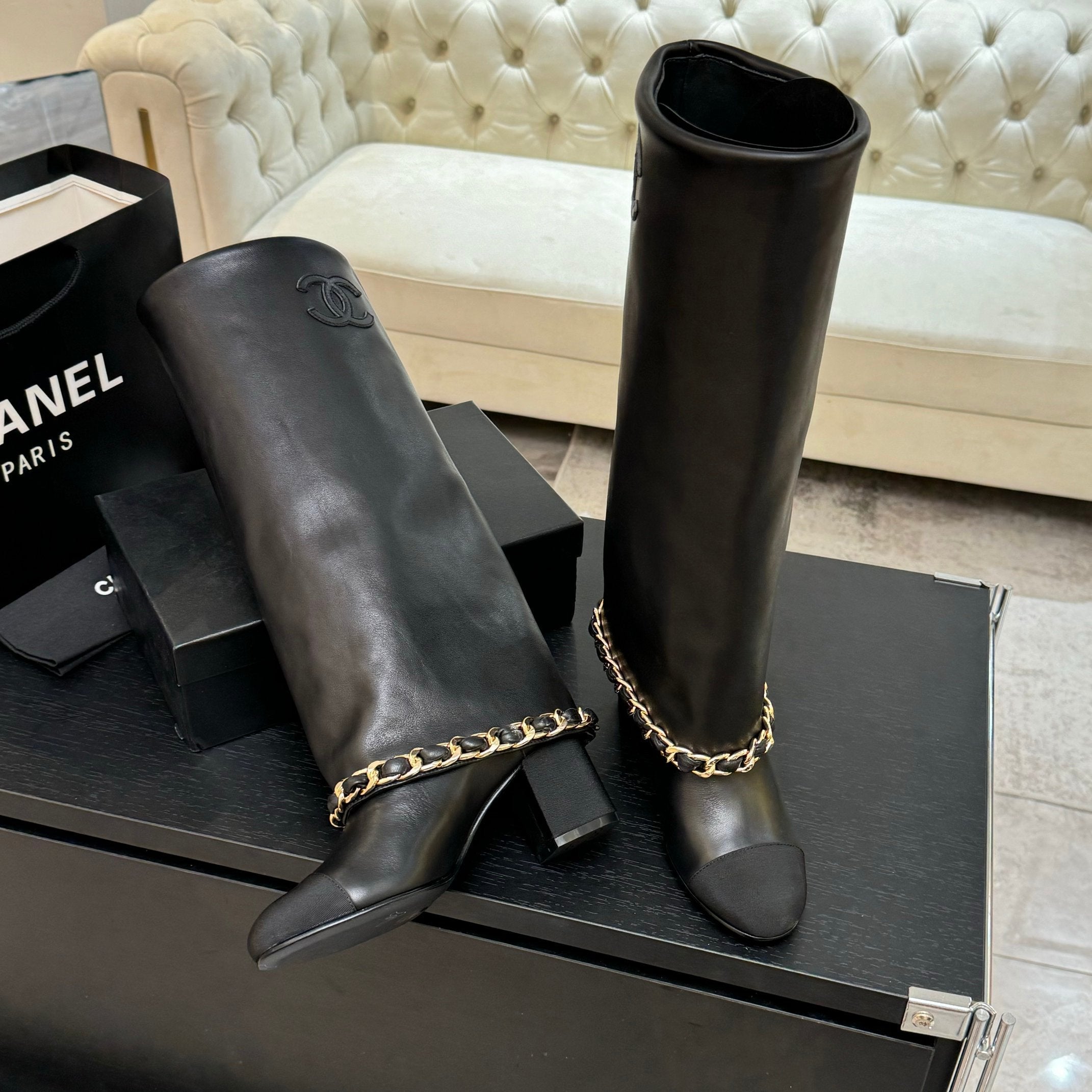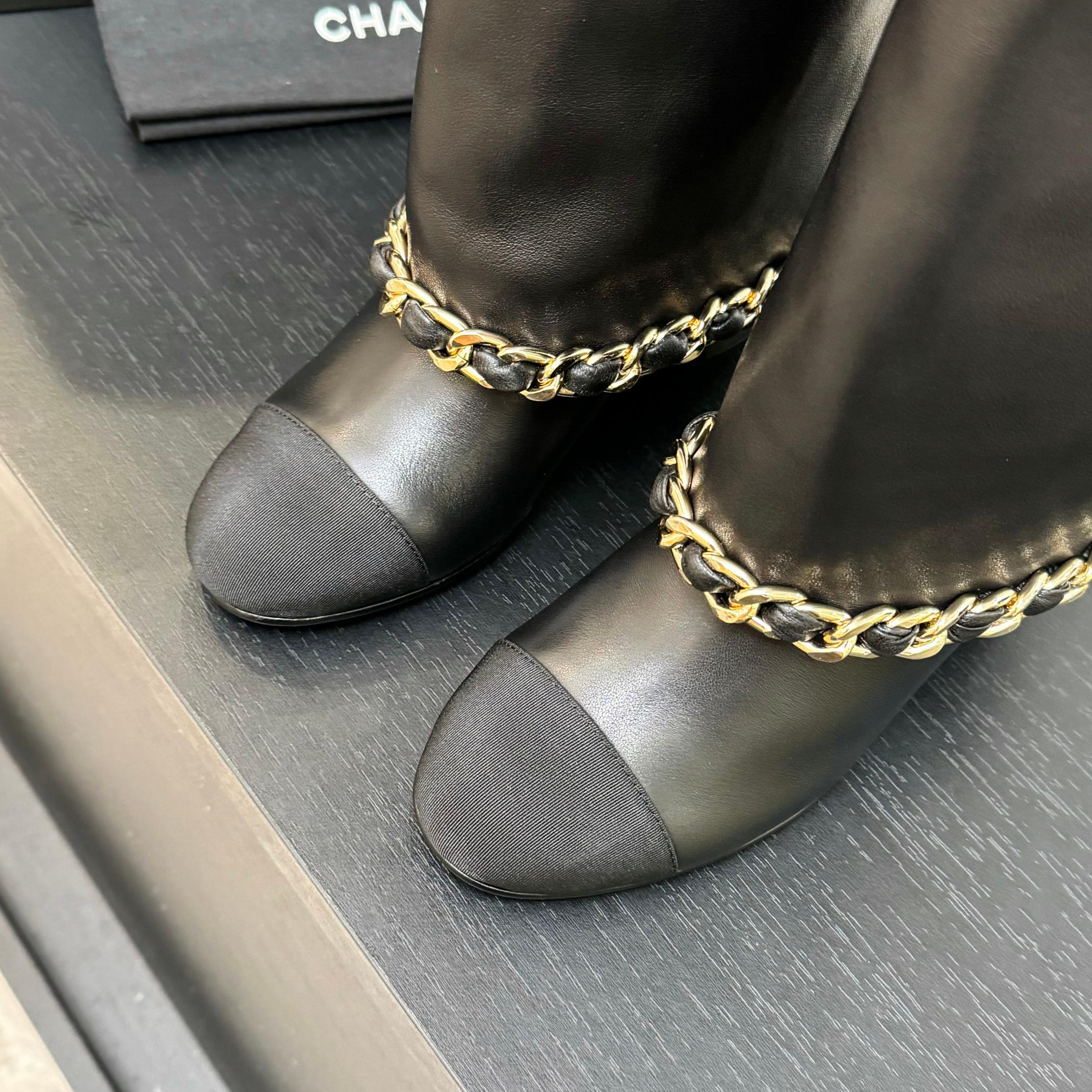 CC 25B High Boots Black Sheepskin With Chain Black Grosgrain 373810