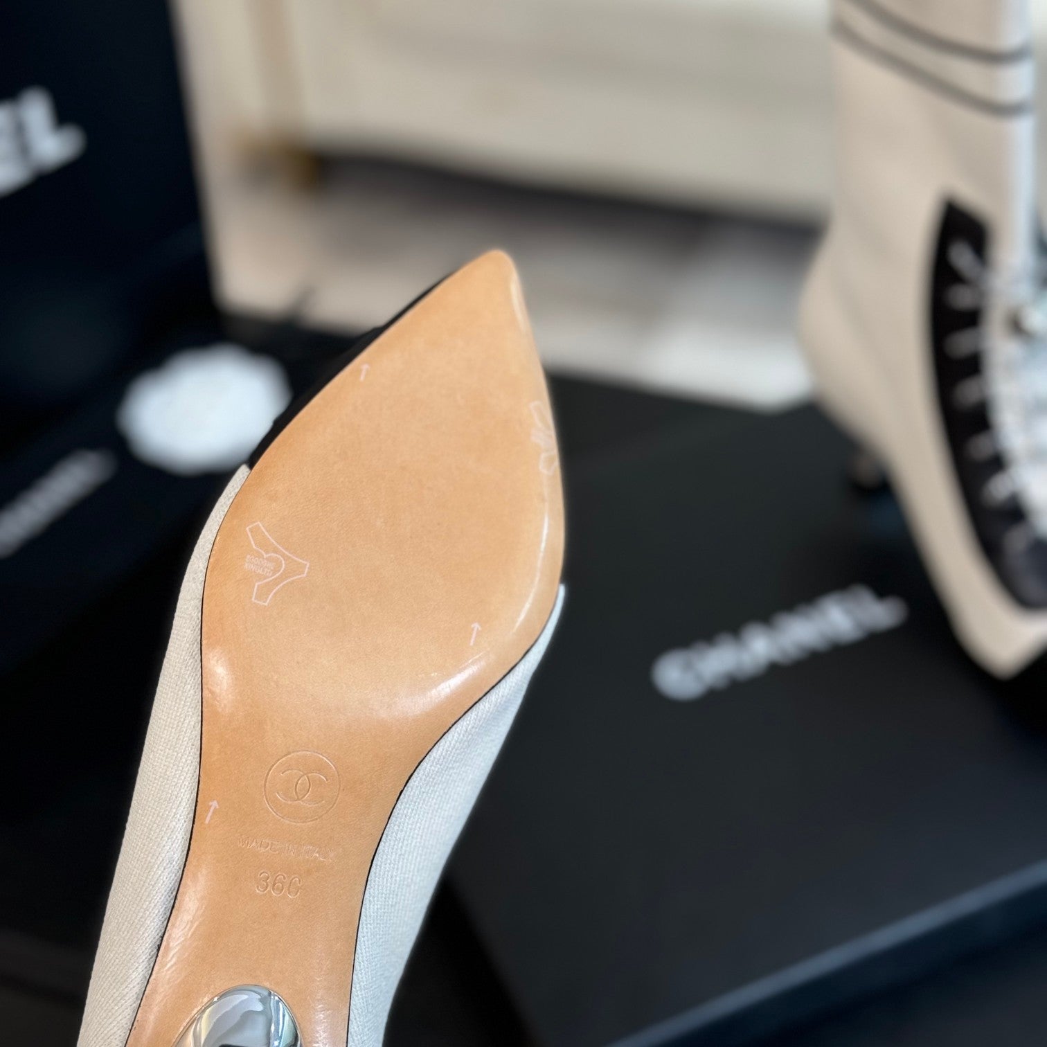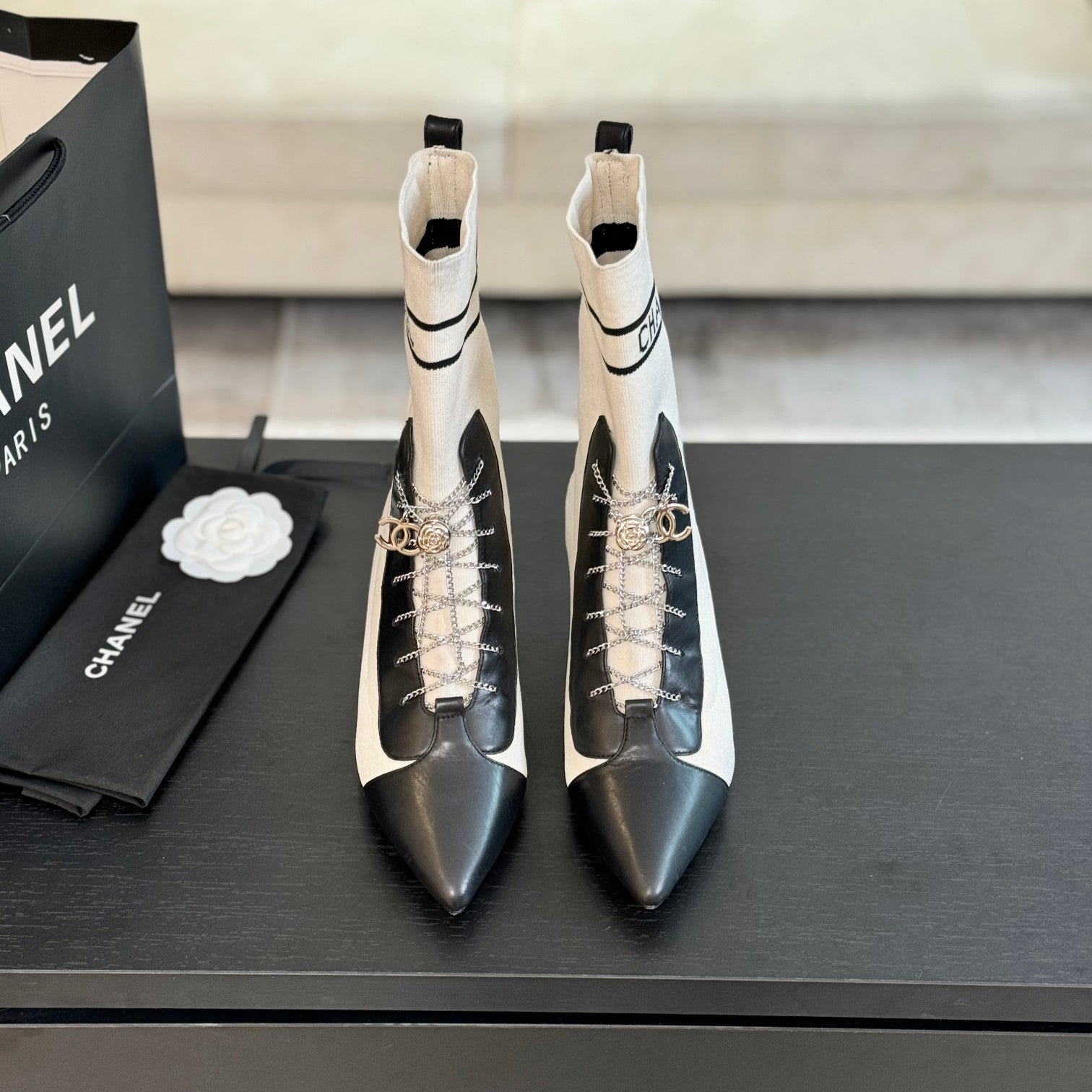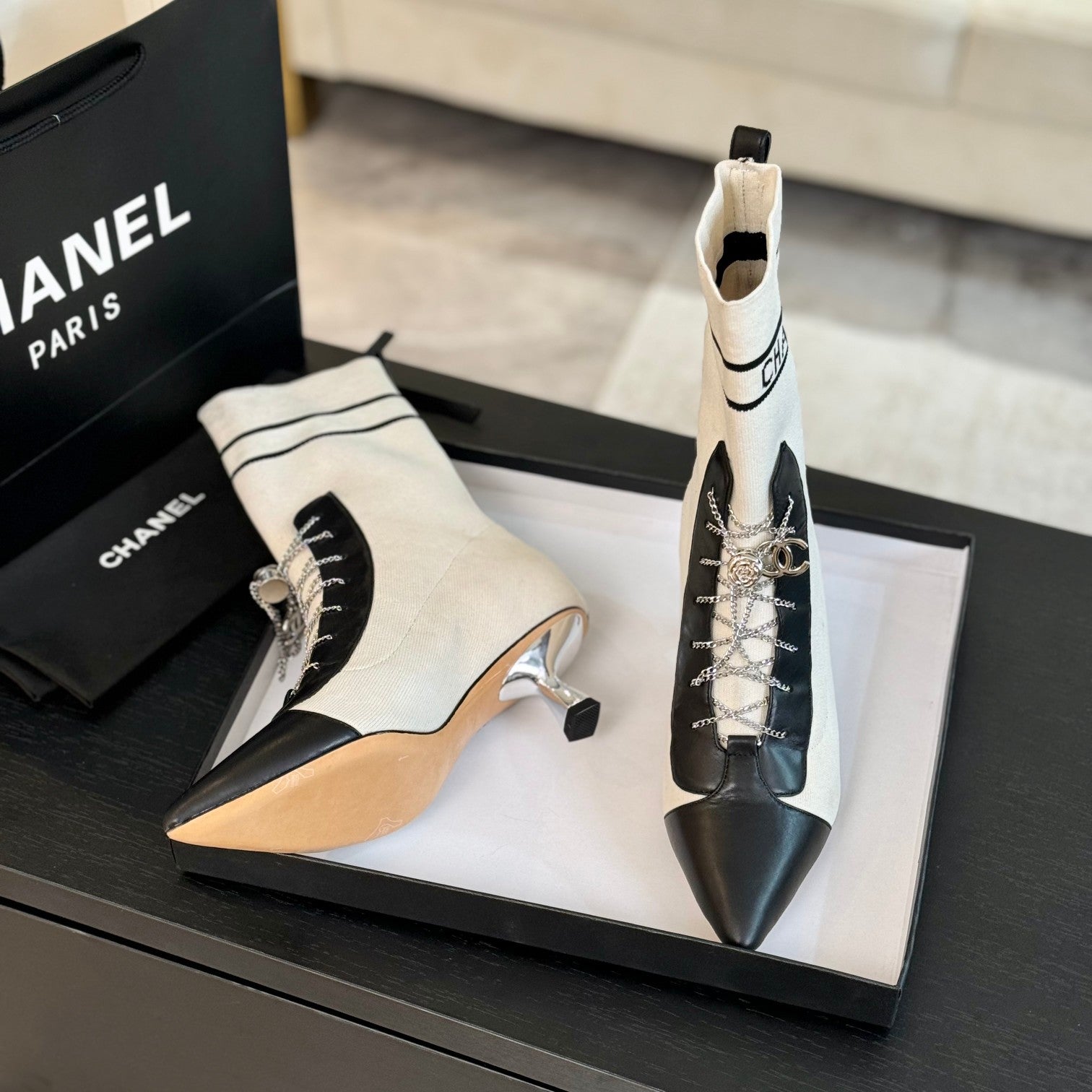 CC Ankle Boots White Black Chain Wool And Lambskin