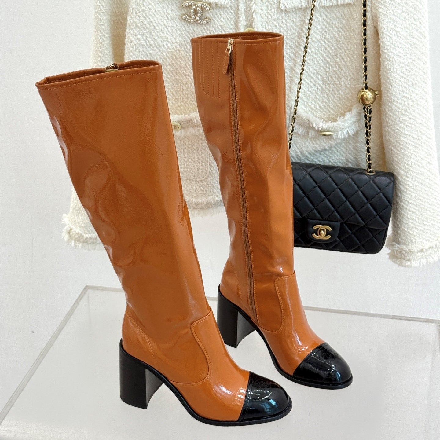 CC Classic Long Boots Block Heel 90mm Burnt Orange Patent Leather 465394