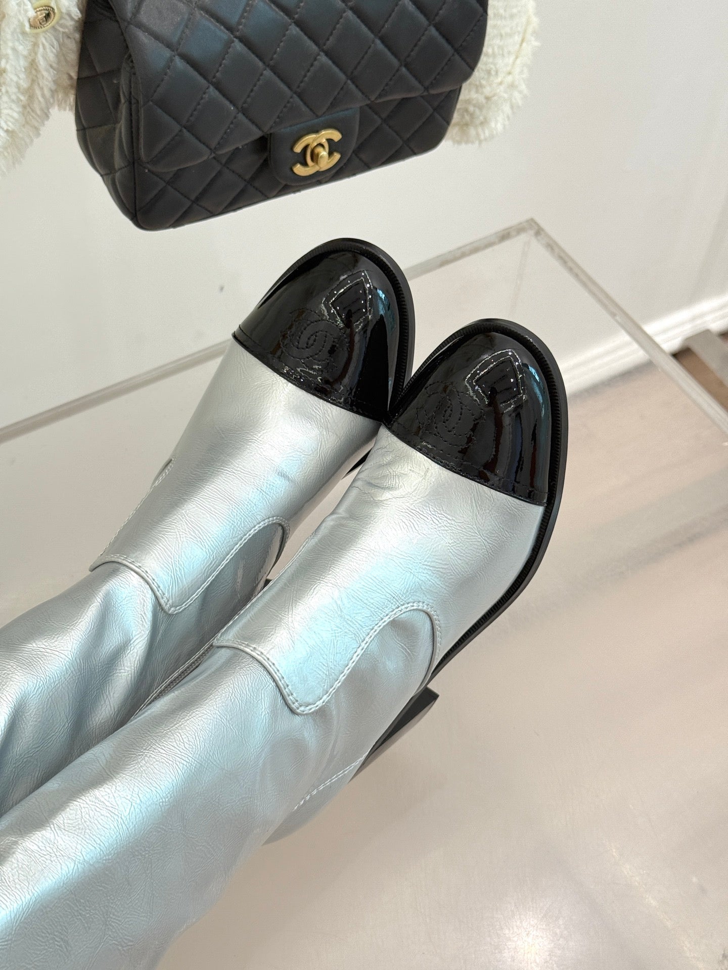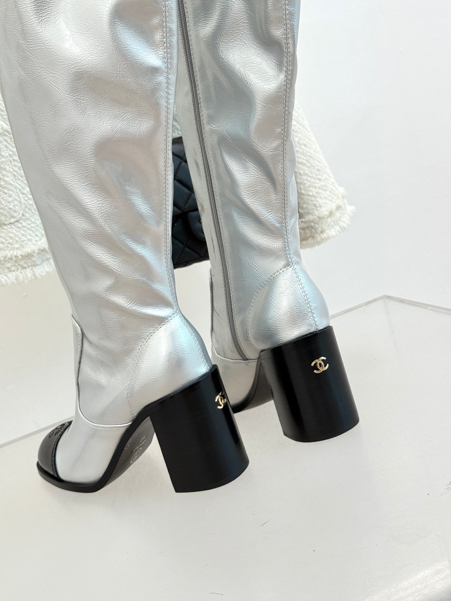 CC Classic Long Boots Block Heel 90mm Sliver Metalic Calfskin 465392