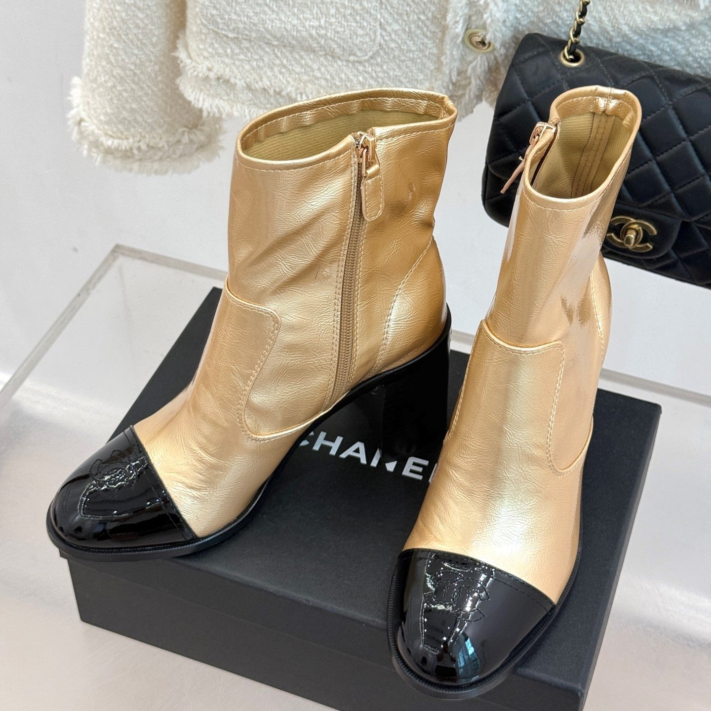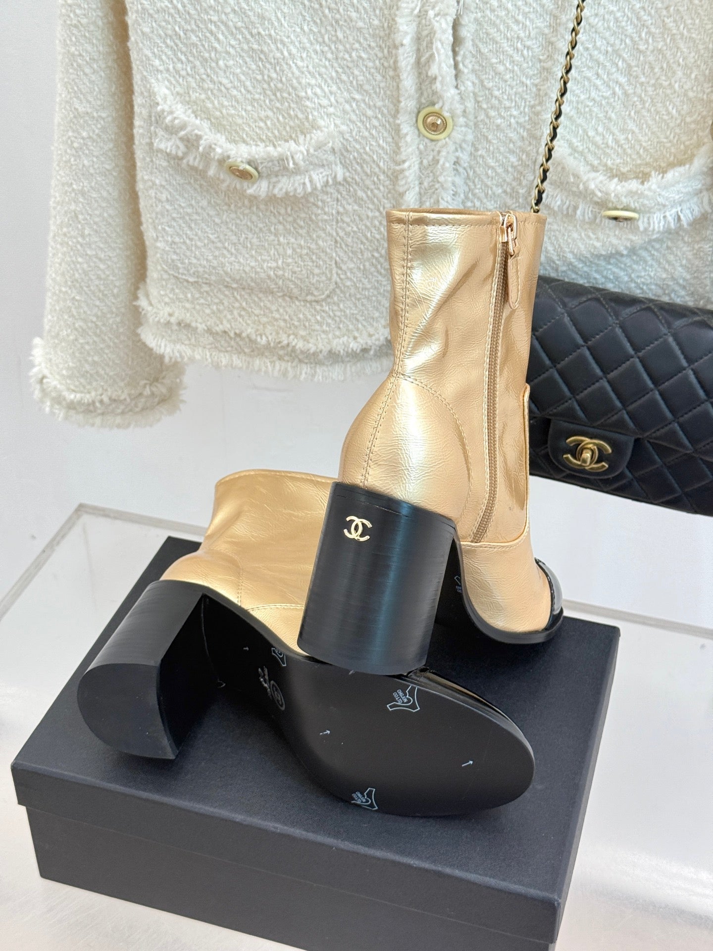 CC Classic Short Boots Block Heel 90mm Gold Metalic Calfskin 465388