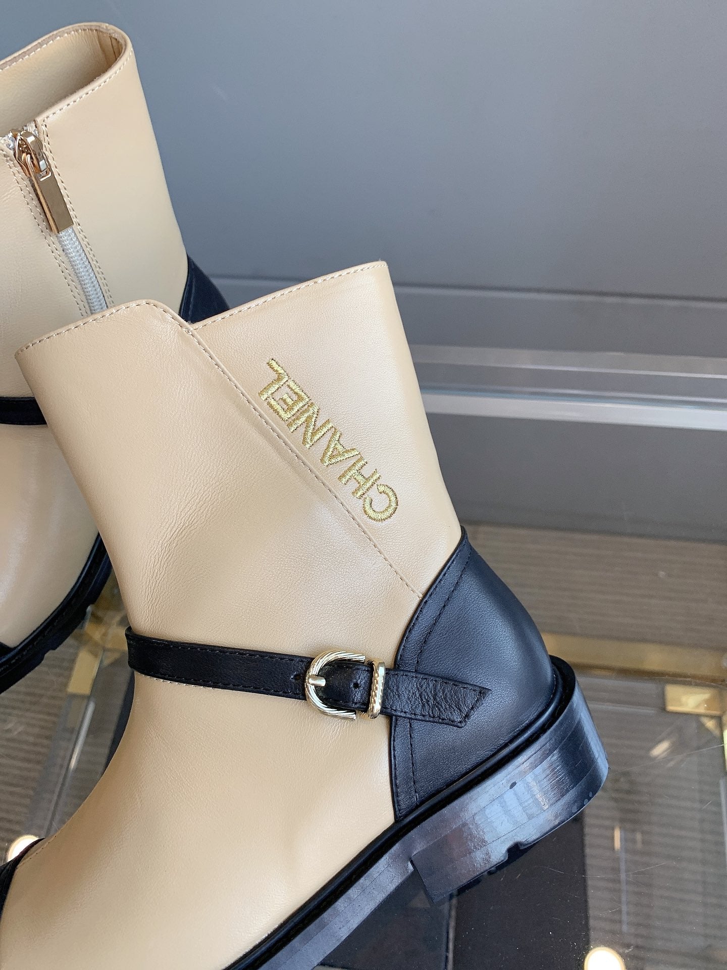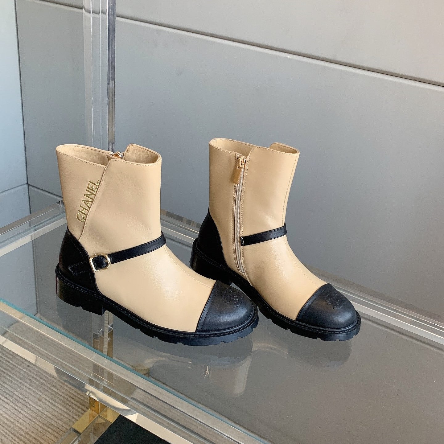 CC Front-Strap Ankle Boots 35mm Black Beige Sheeepskin 464552