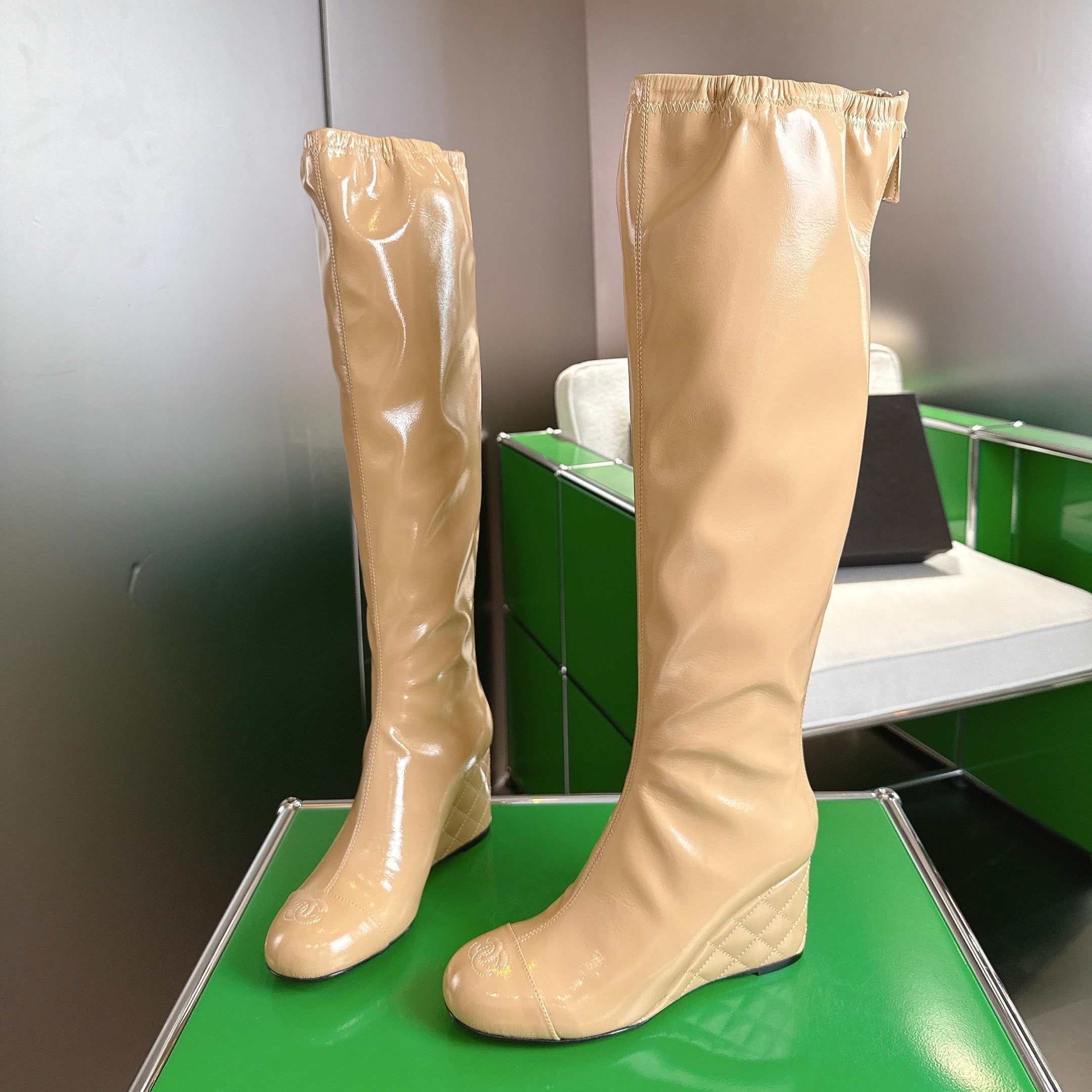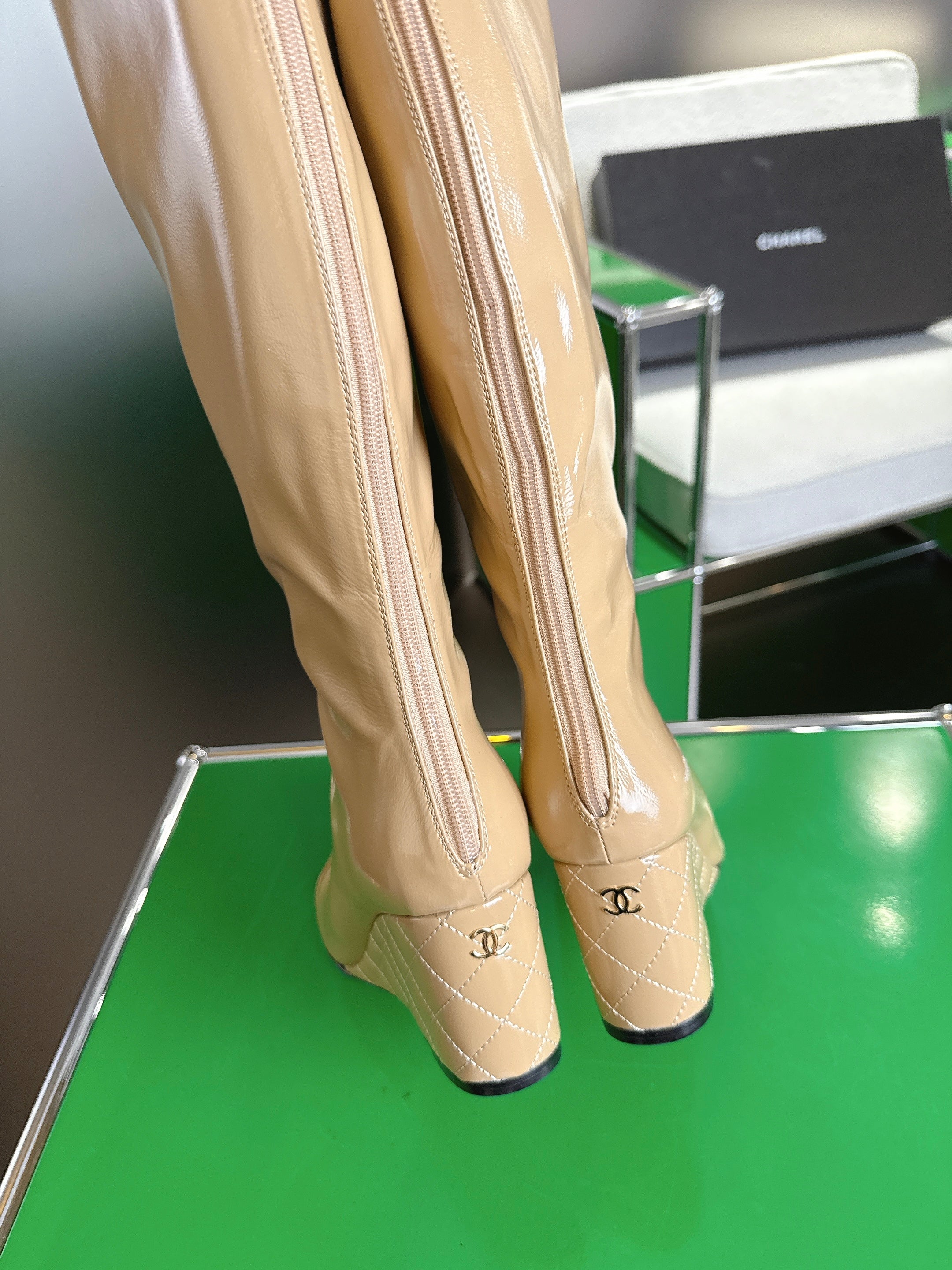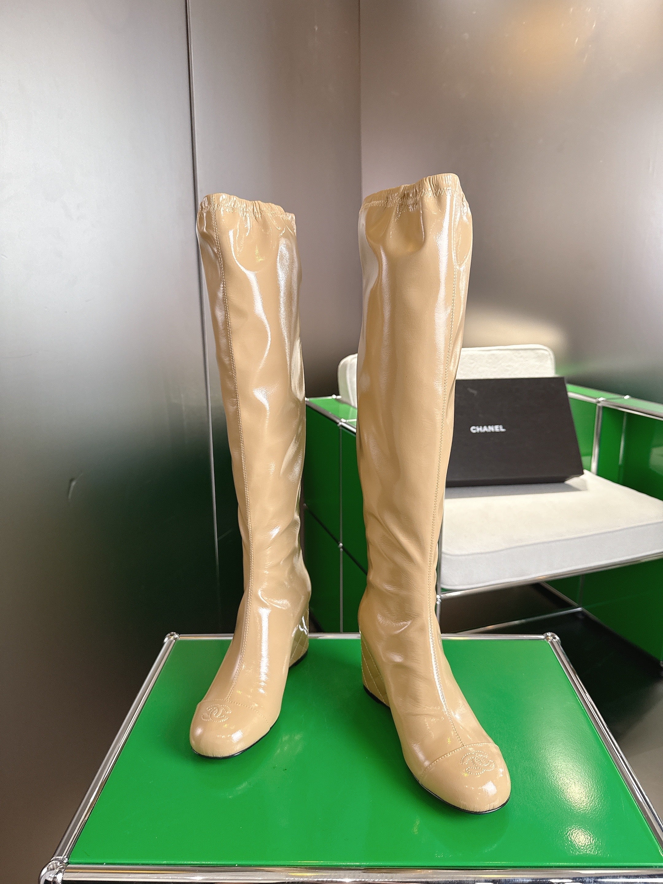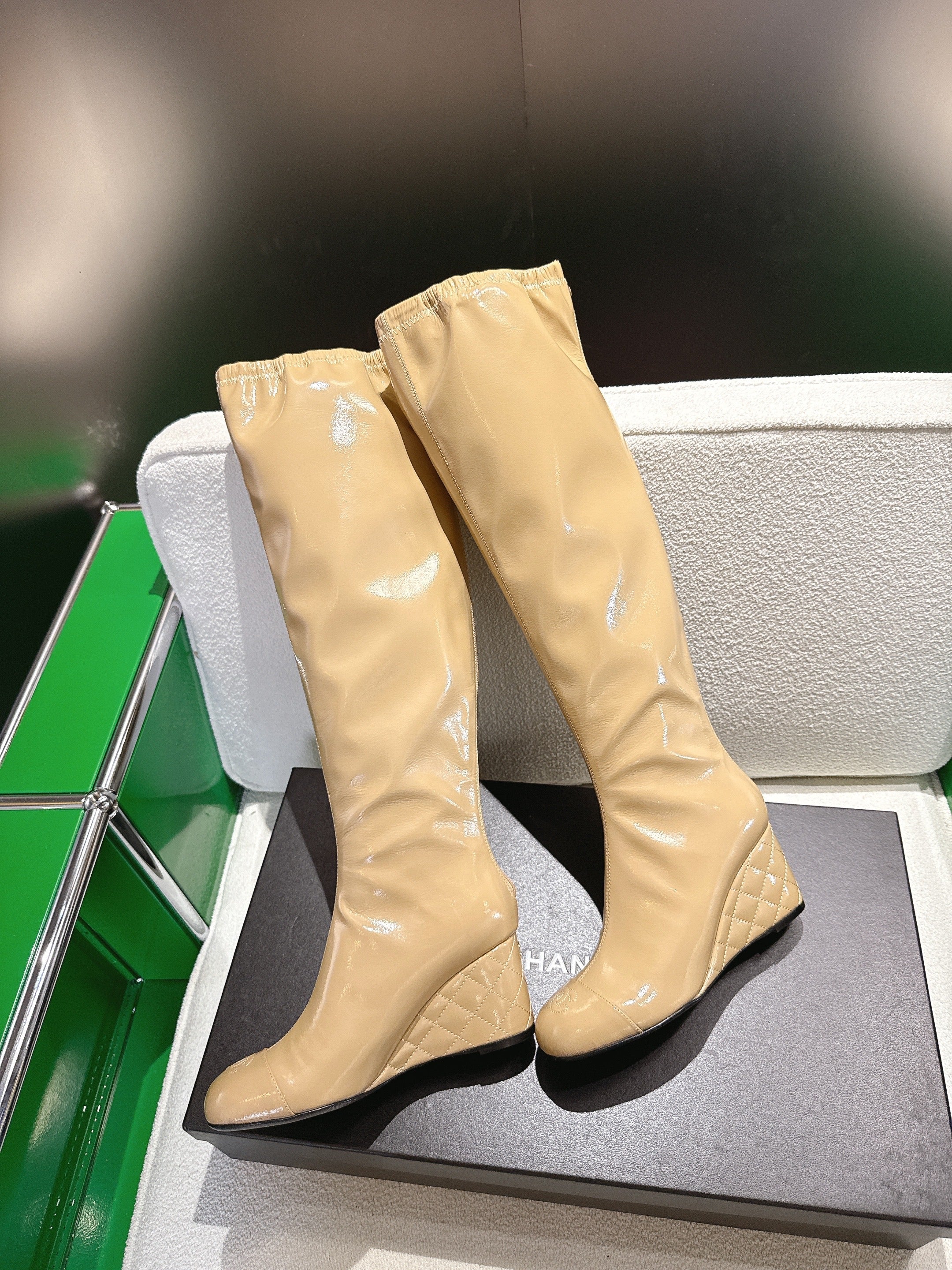 Chanel High-Top Boots Platform Heel 7cm Beige Glossy Leather 507535