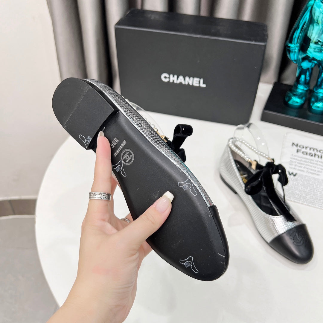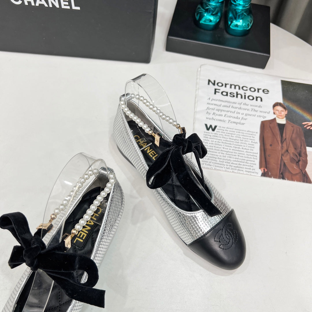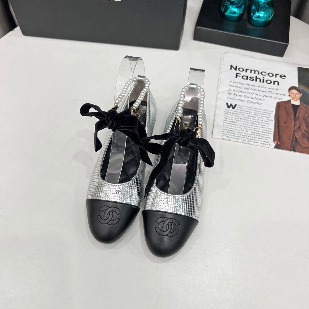 CC Mary Jane White Black Studded With Pearls Lambskin And Cowhide