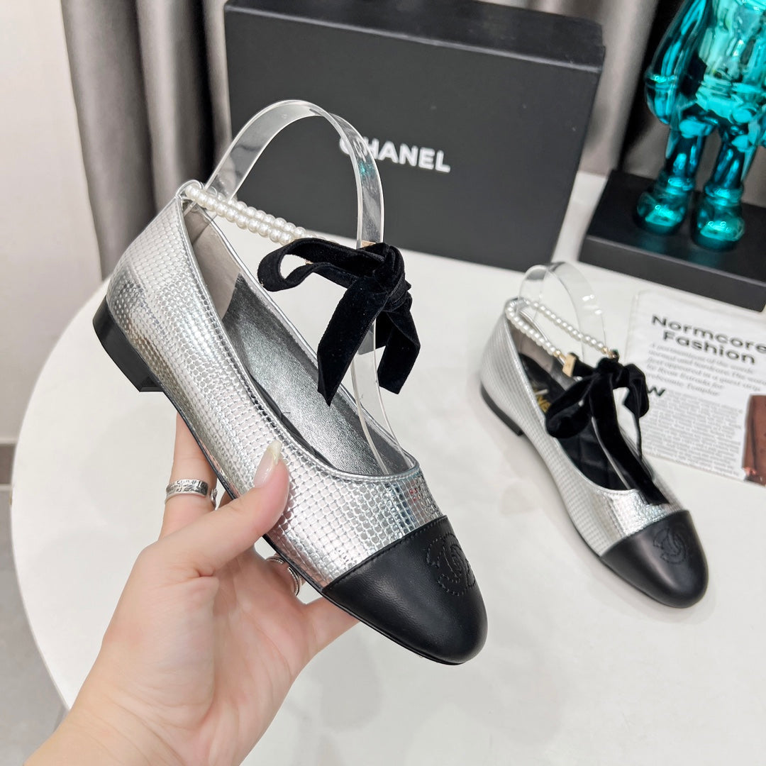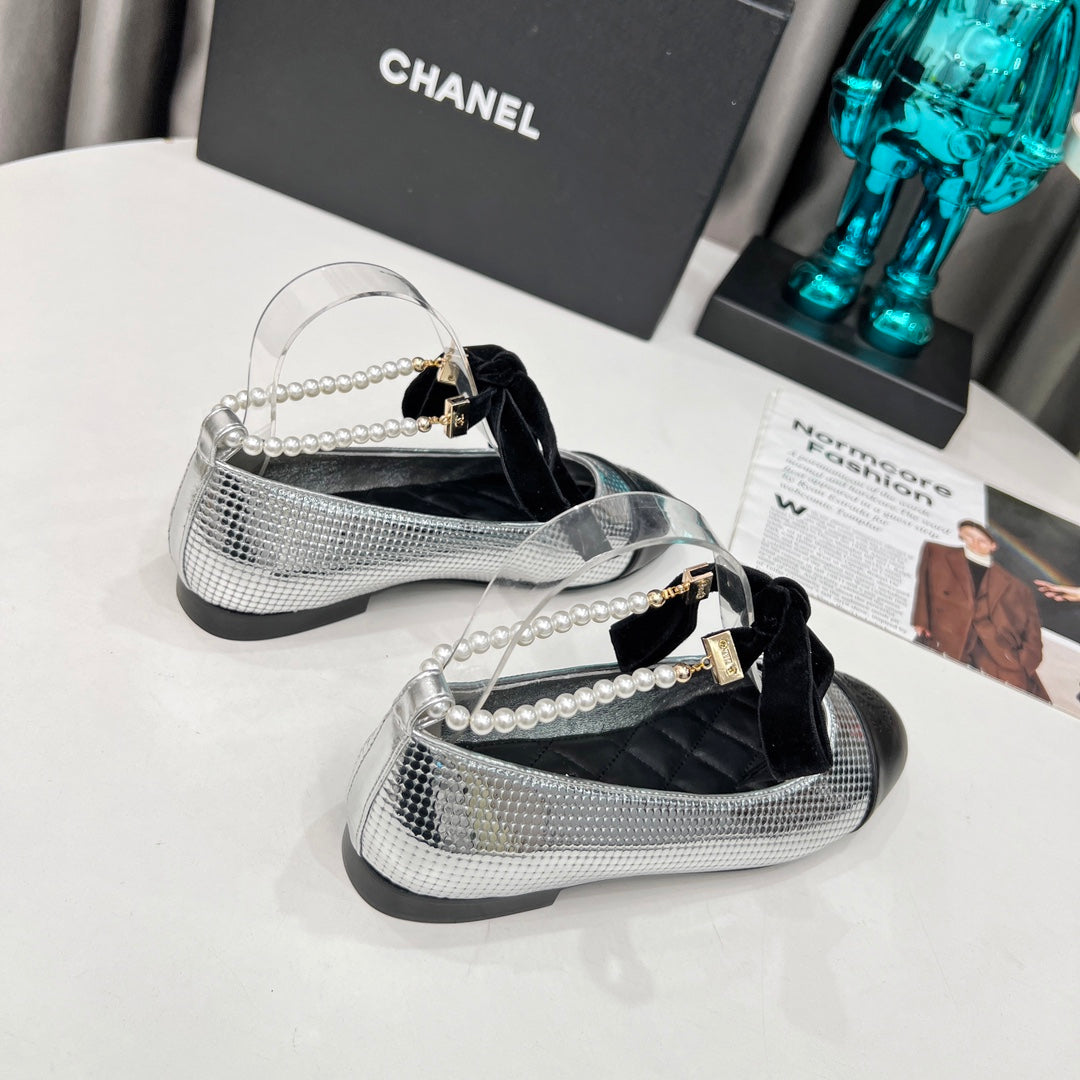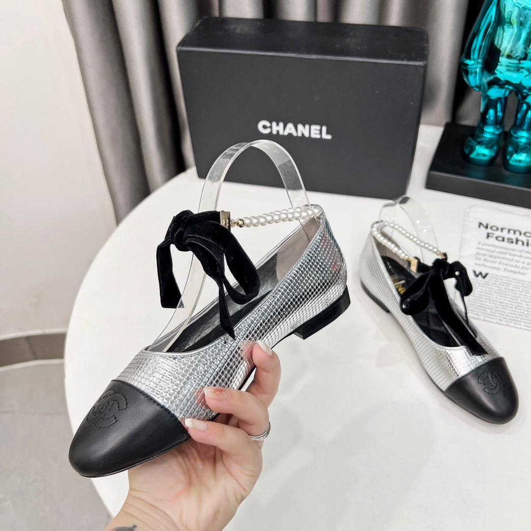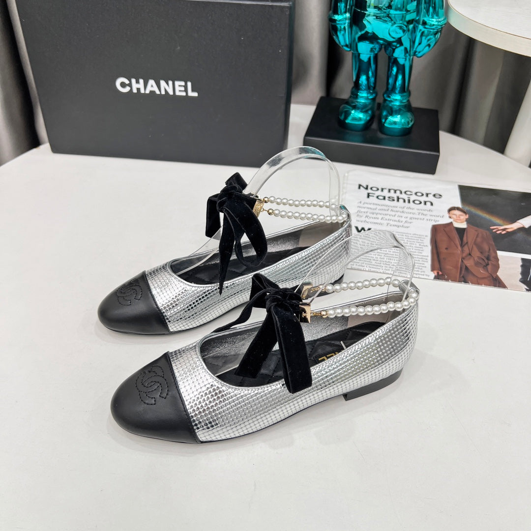CC Mary Jane White Black Studded With Pearls Lambskin And Cowhide