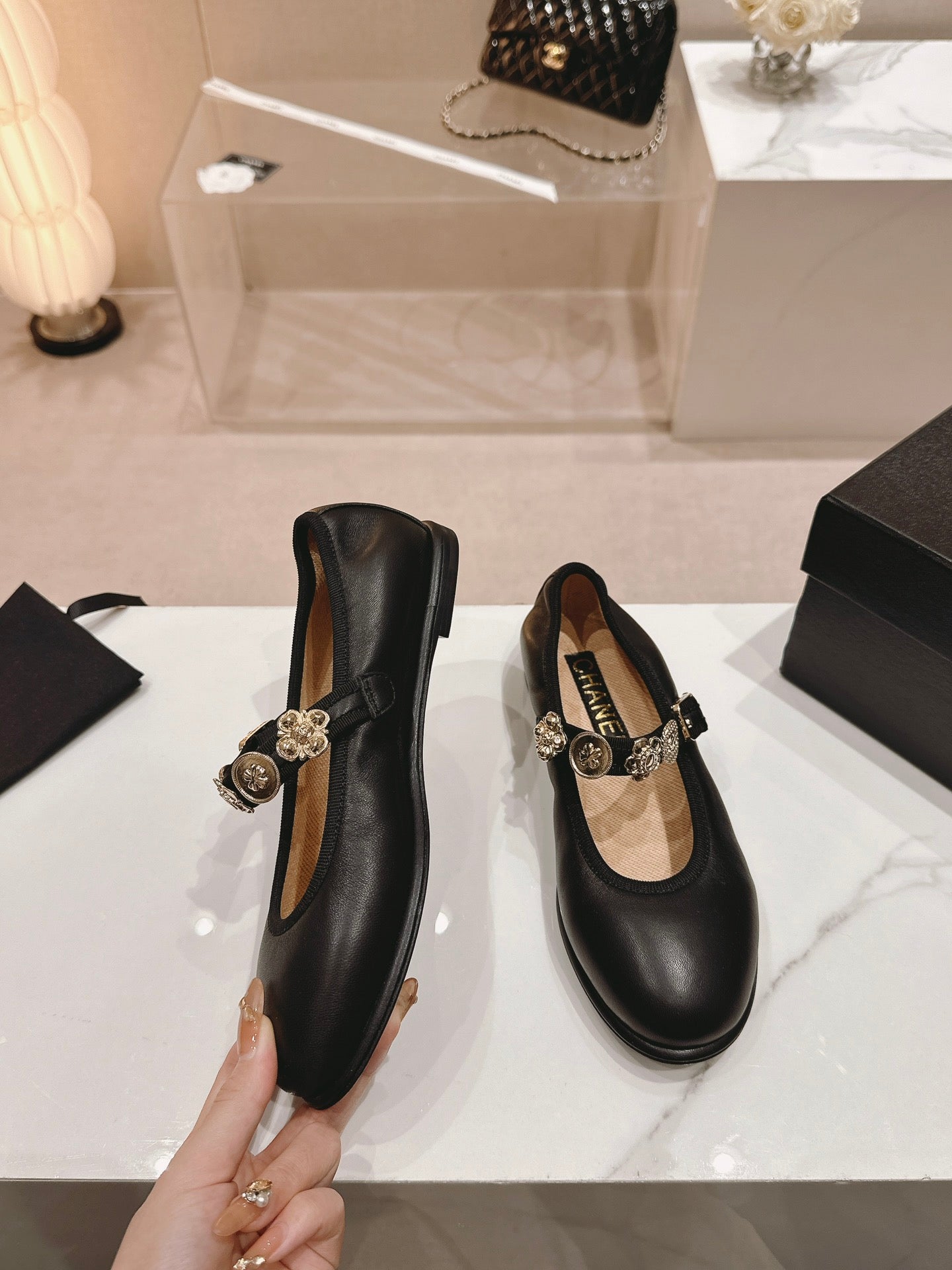 CC MARY JANES BLACK CALFSKIN LIGHT GOLD METALIC