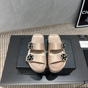 CC 25SS Flower Buckle Platform Beach Slides in Beige Cowhide
