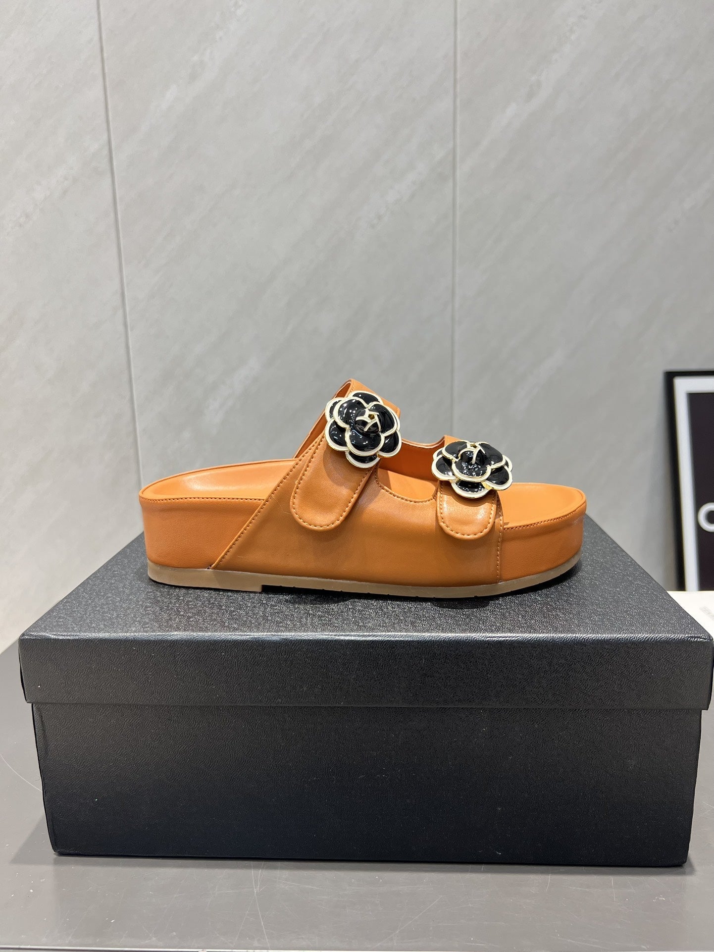 CC 25SS Flower Buckle Platform Beach Slides in Tan Cowhide