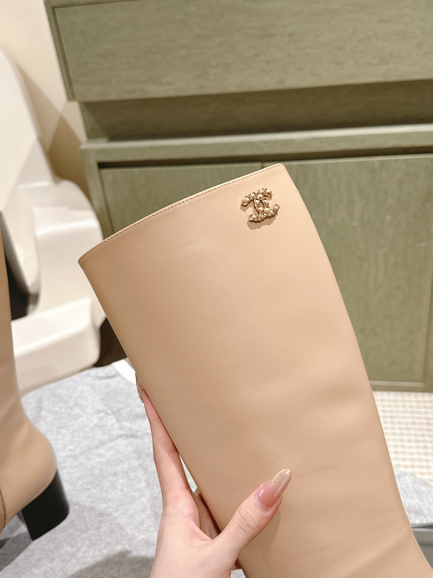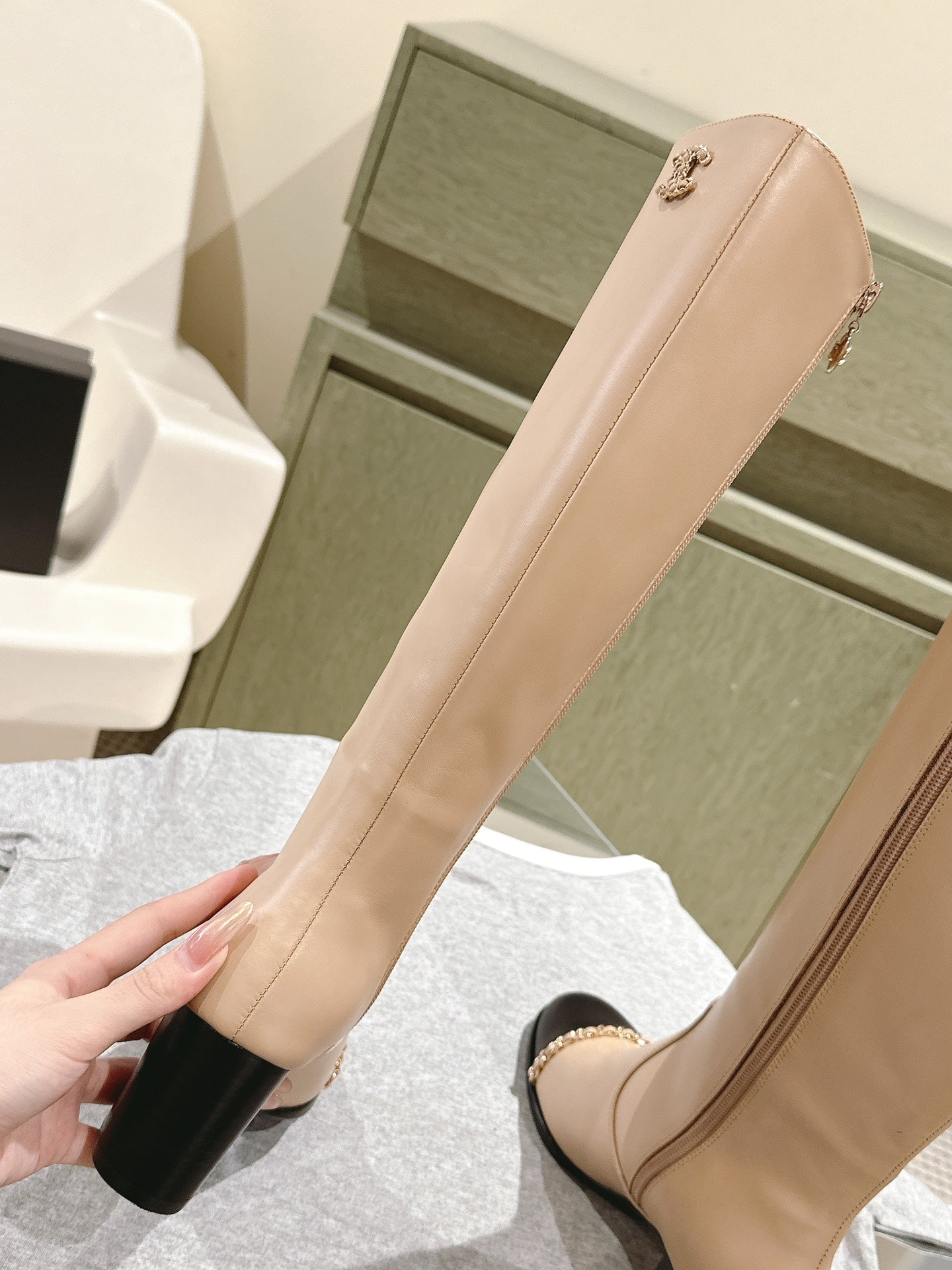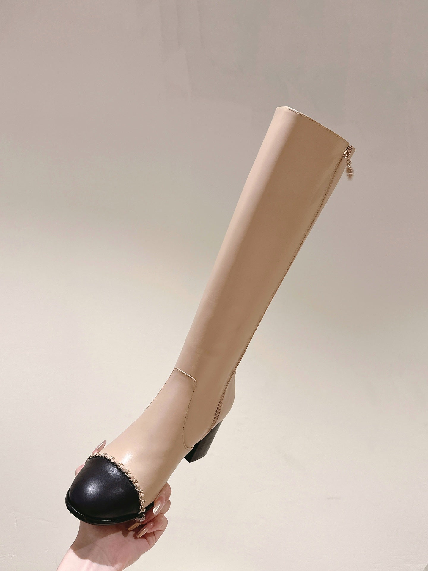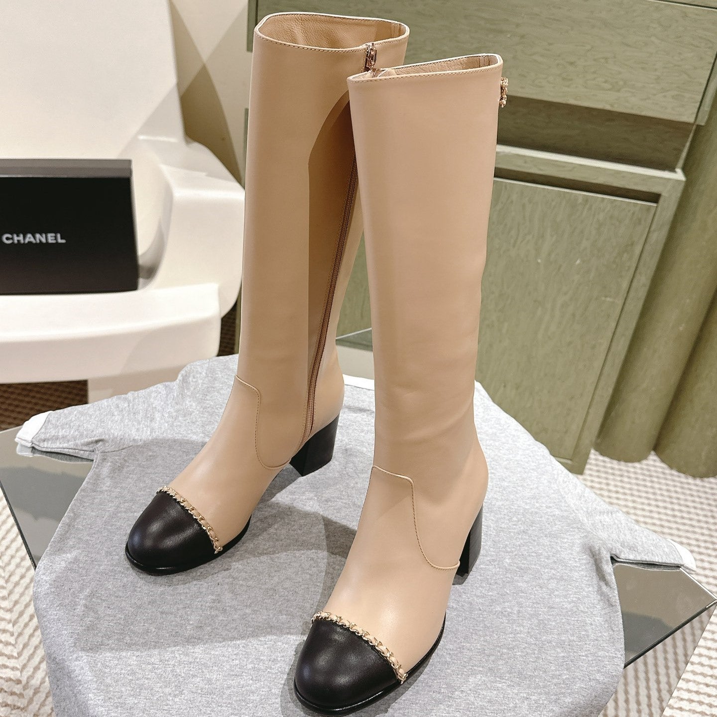 CC 24 FW Knee-High Boots with Chain 70mm Beige Black Cowhide 447185