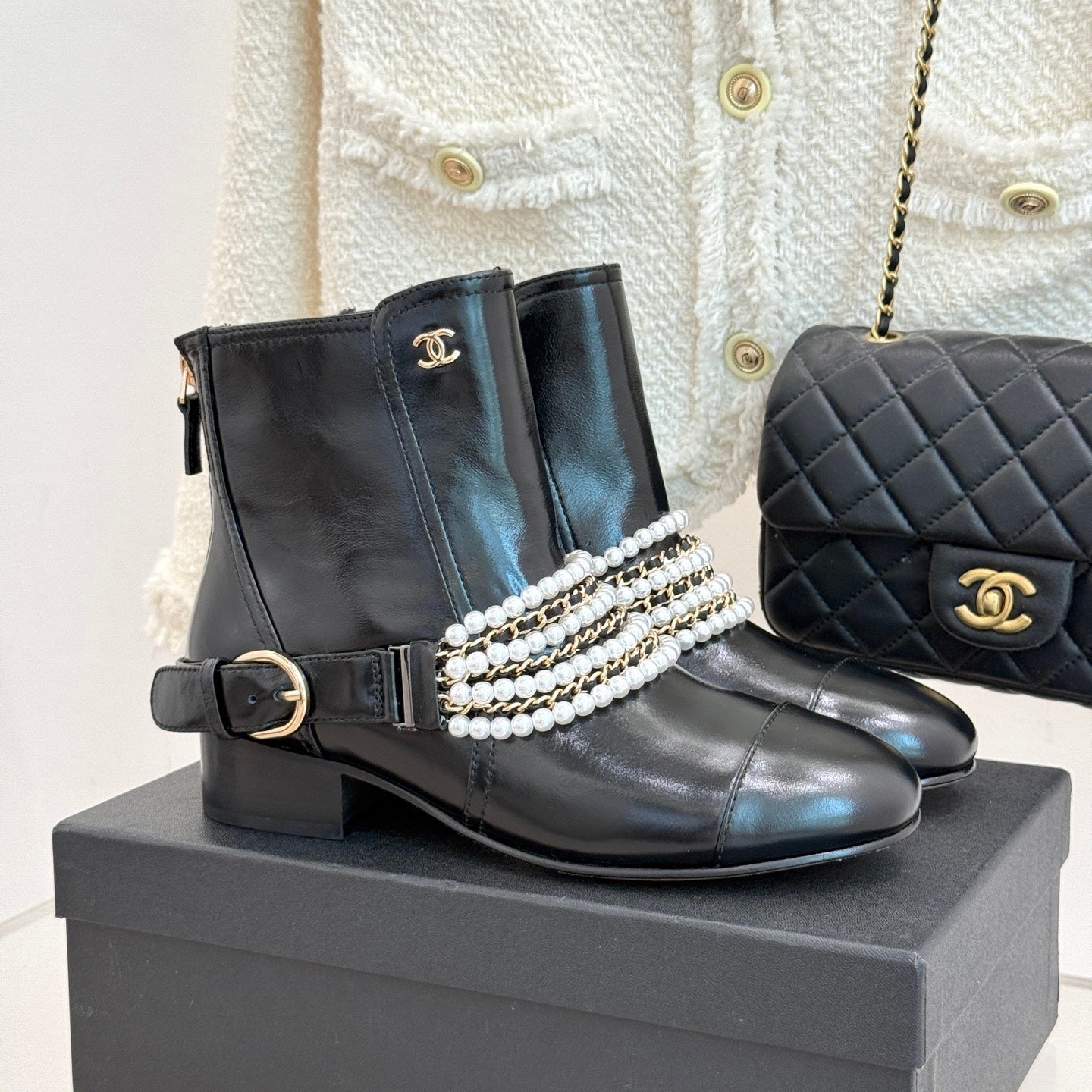 CC Classic Pearl Chain Colorblock Block Heel Ankle Boots Black Glossy Lambskin 473316