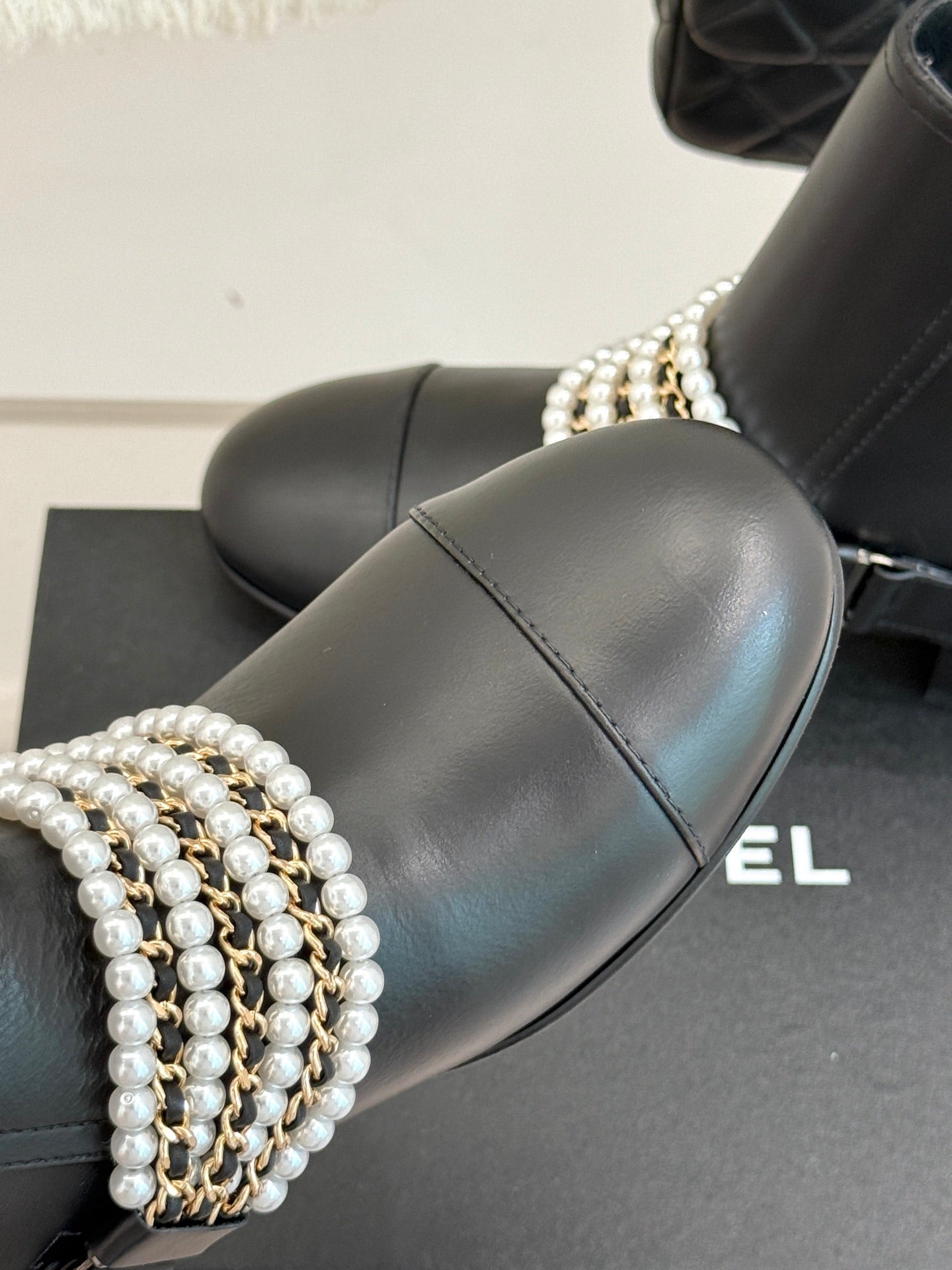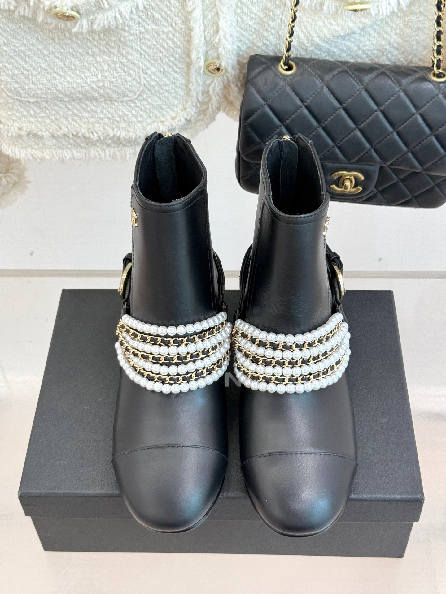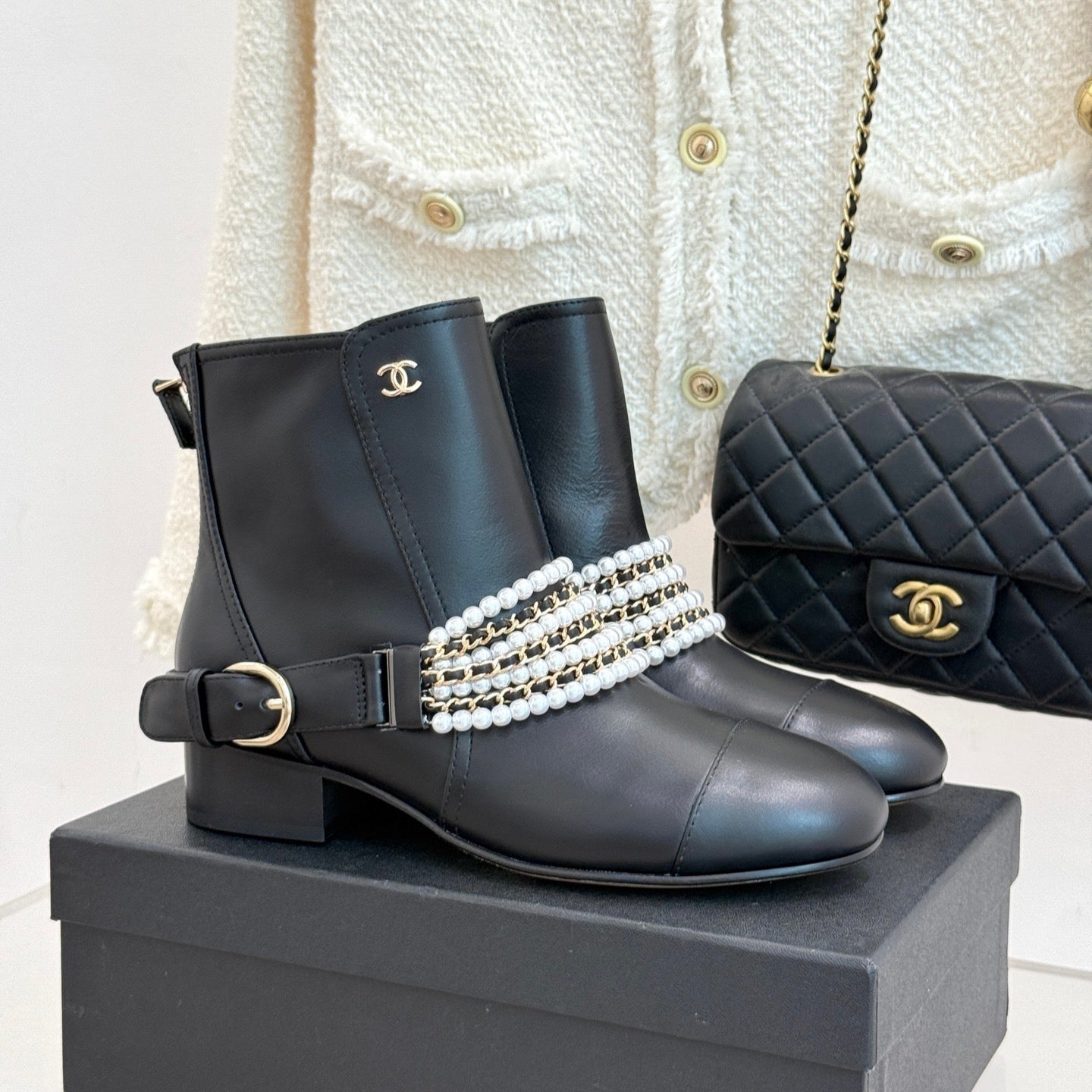 CC Classic Pearl Chain Colorblock Block Heel Ankle Boots Black Lambskin 473319