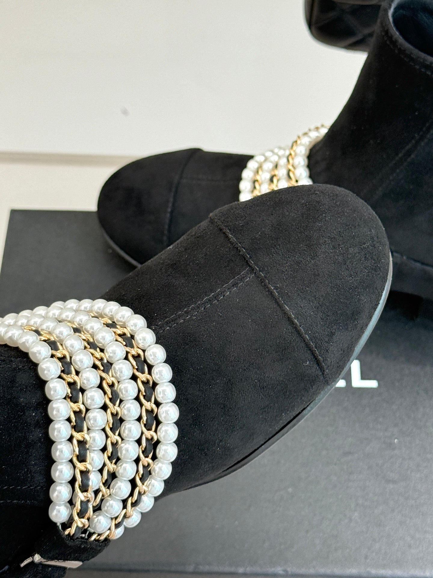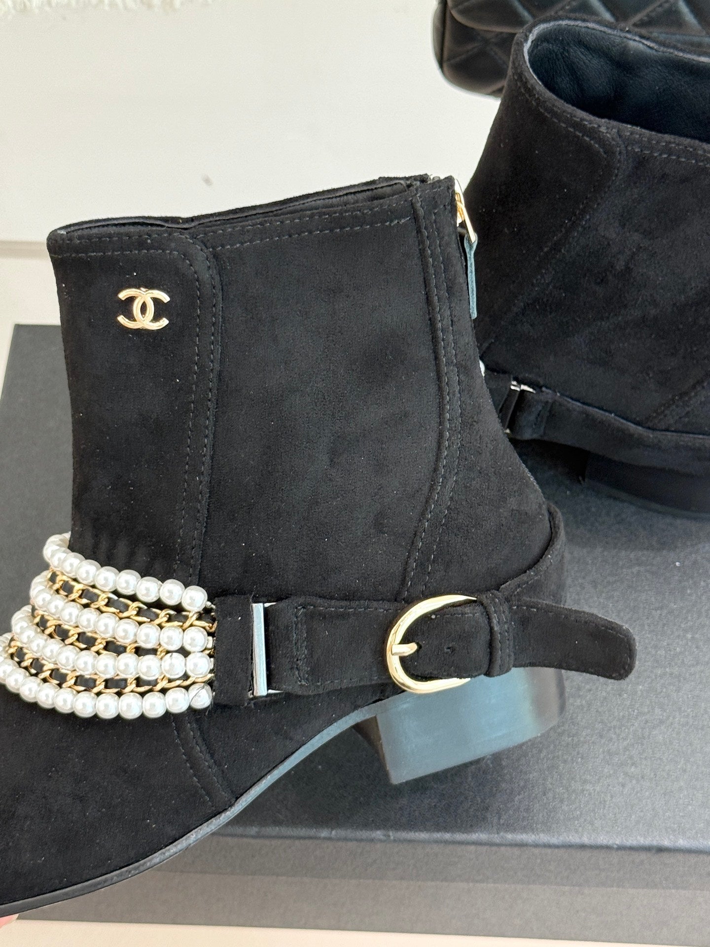 CC Classic Pearl Chain Colorblock Block Heel Ankle Boots Black Suede 473317