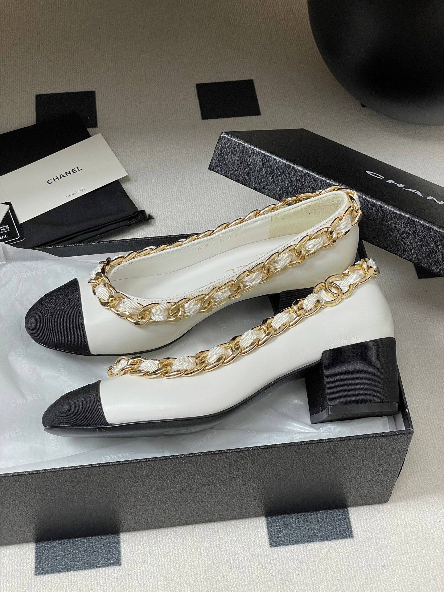 Chanel 25A 55mm Pump Big Chain Double C White Black Sheepskin 393814