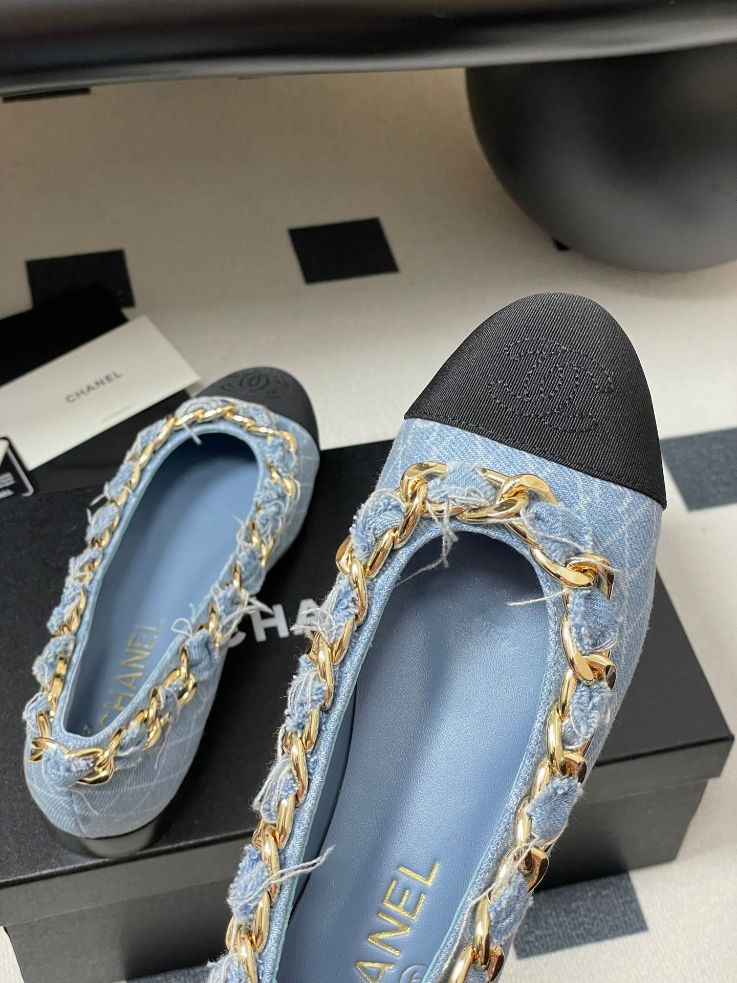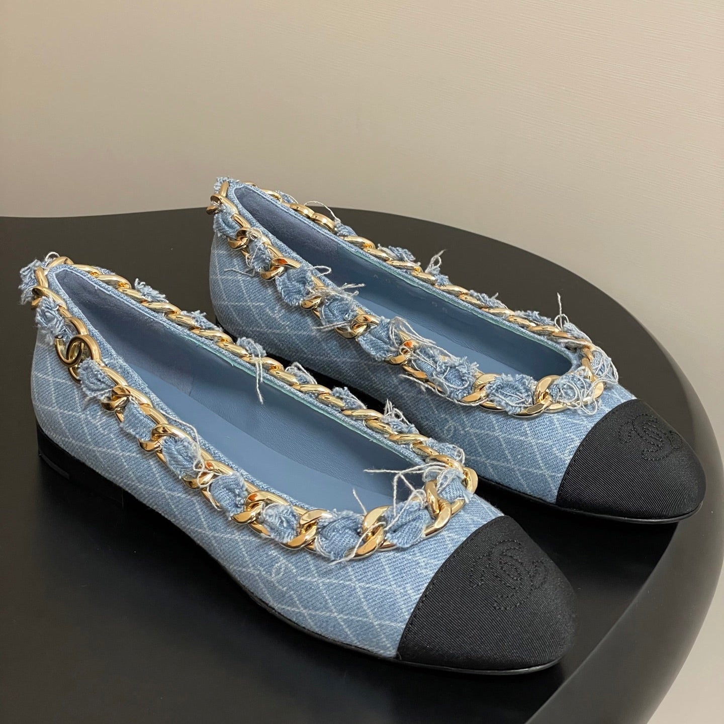 Chanel 25A Ballet Flats Big Chain Double C Blue Denim Sheepskin 393817