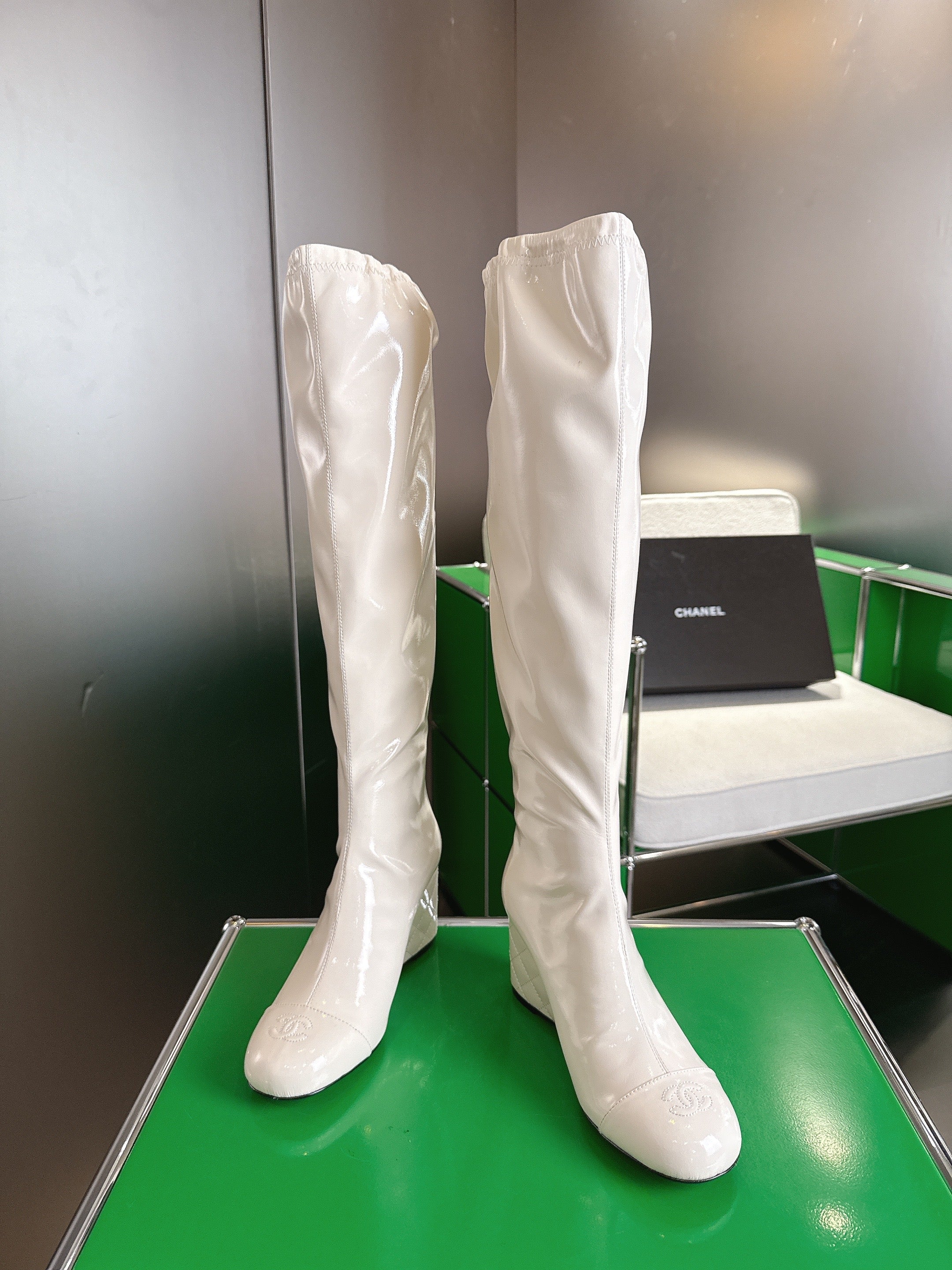 Chanel High-Top Boots Platform Heel 7cm Cream Glossy Leather 507533