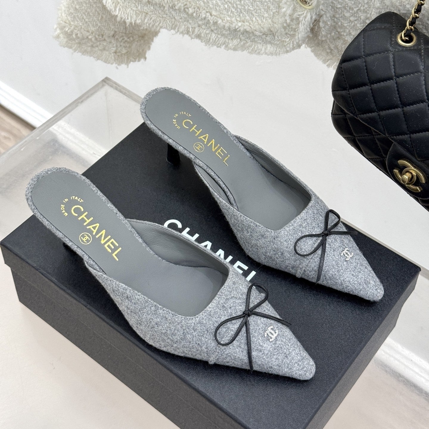 CC 25C Bowknot Pointed High Heel Half Slippers 60mm Grey Linen 265661