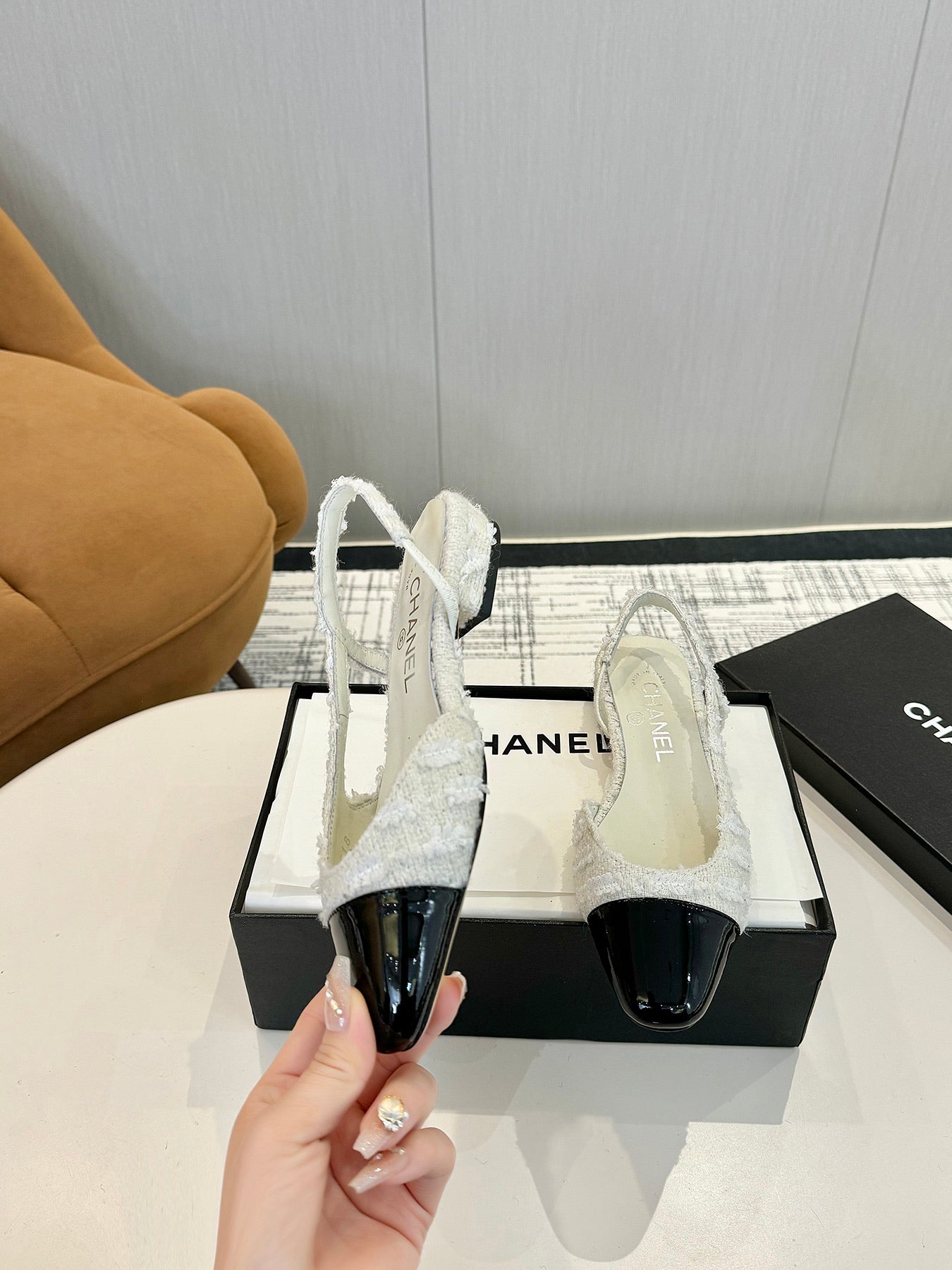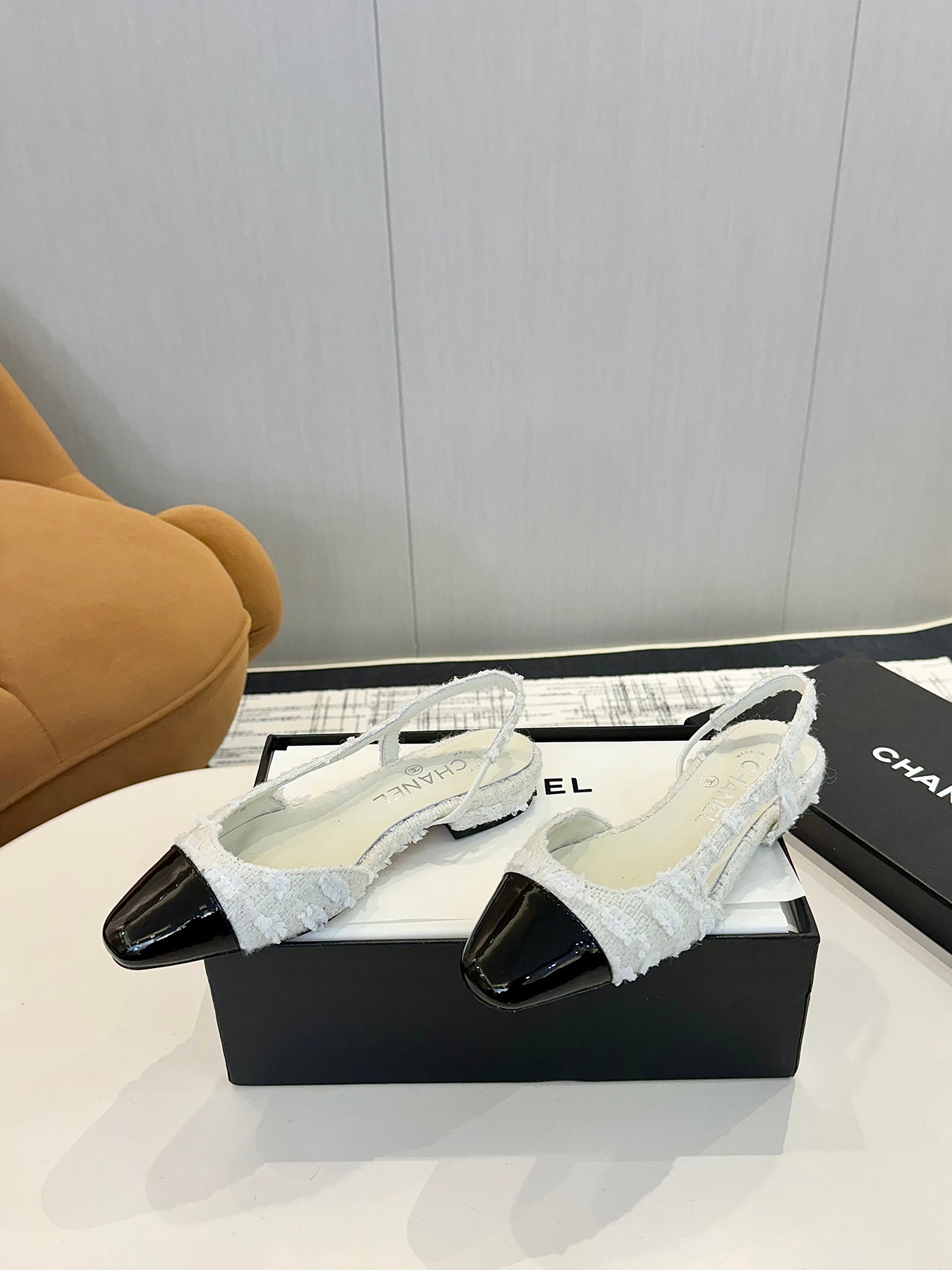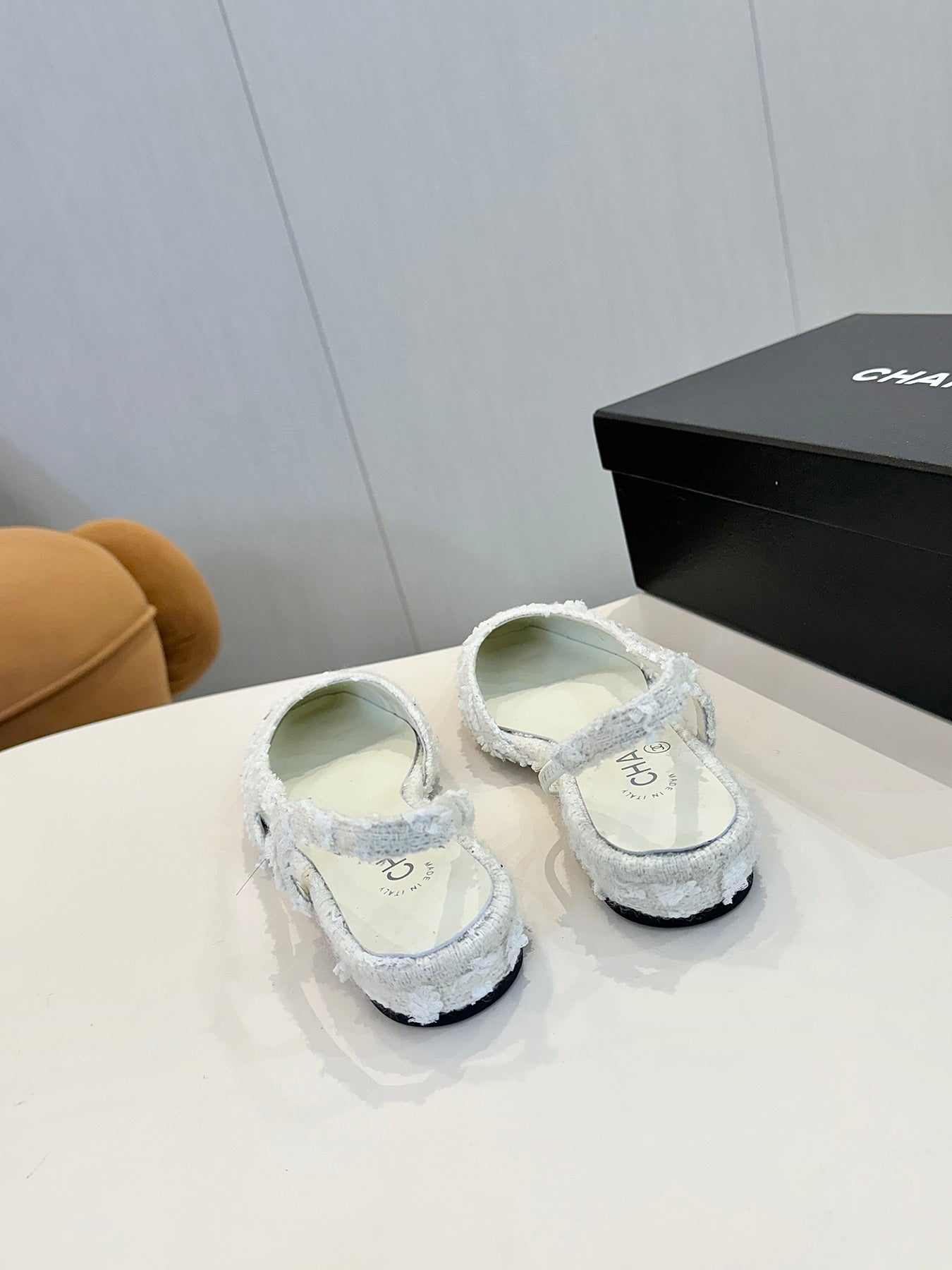 cc 25c slingback flat white tweed black grosgrain 233609