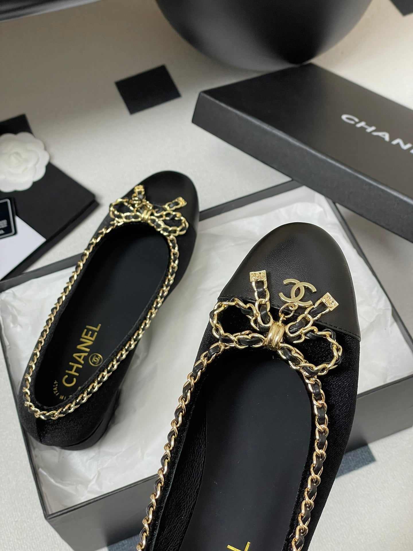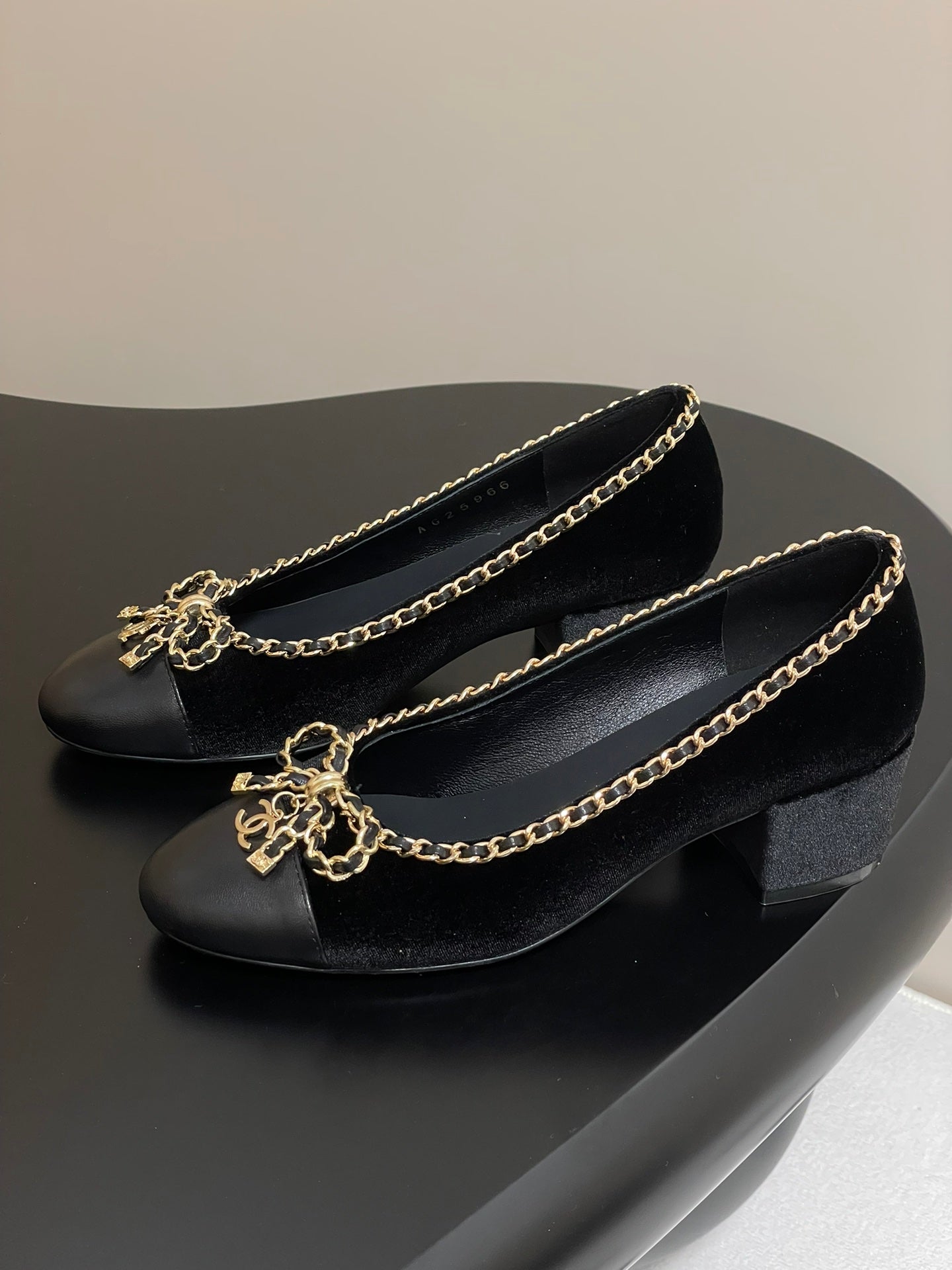 CC 25S 60mm Chain Bow Single Pumps Black Velvet Sheepskin 247660