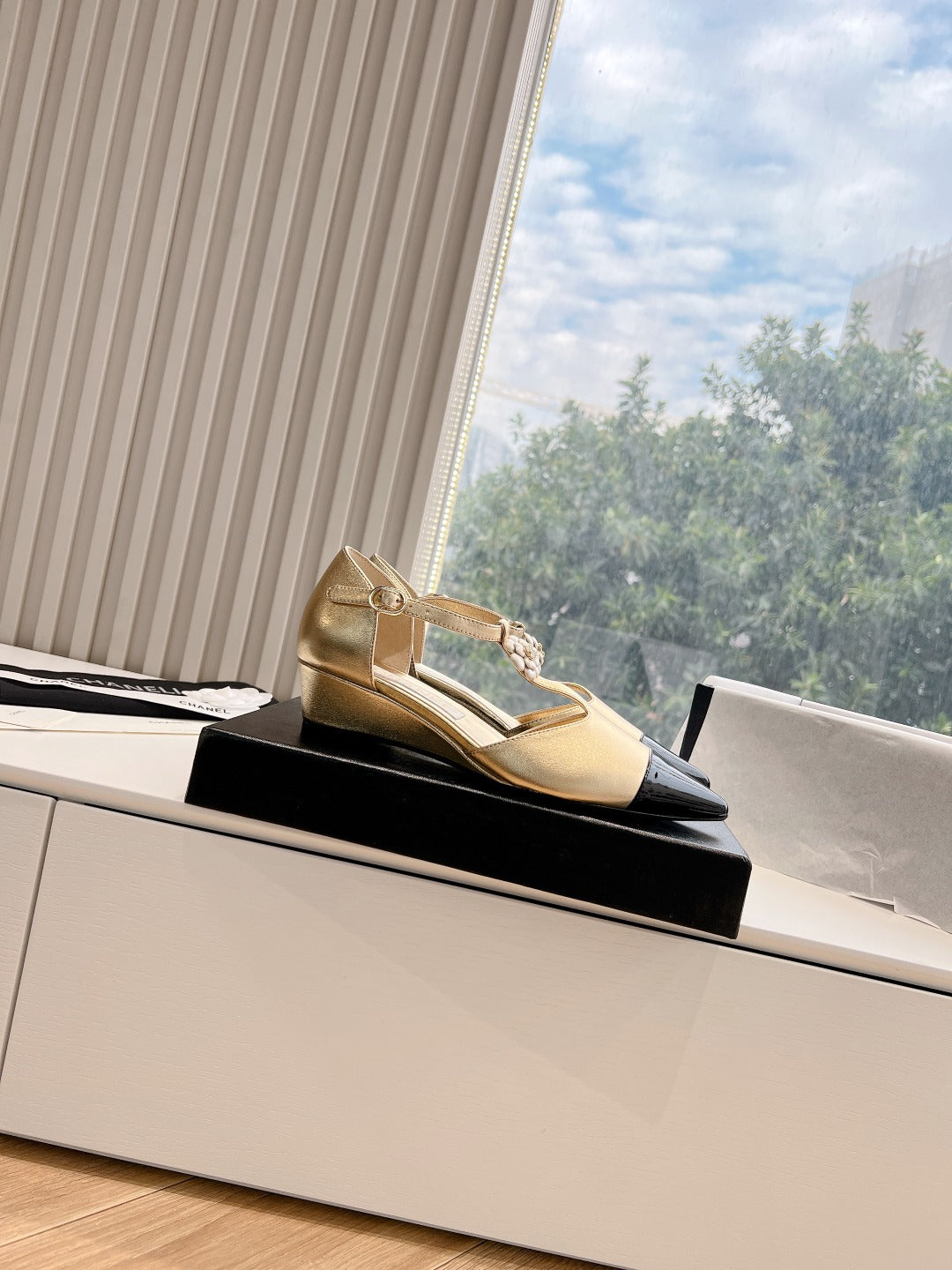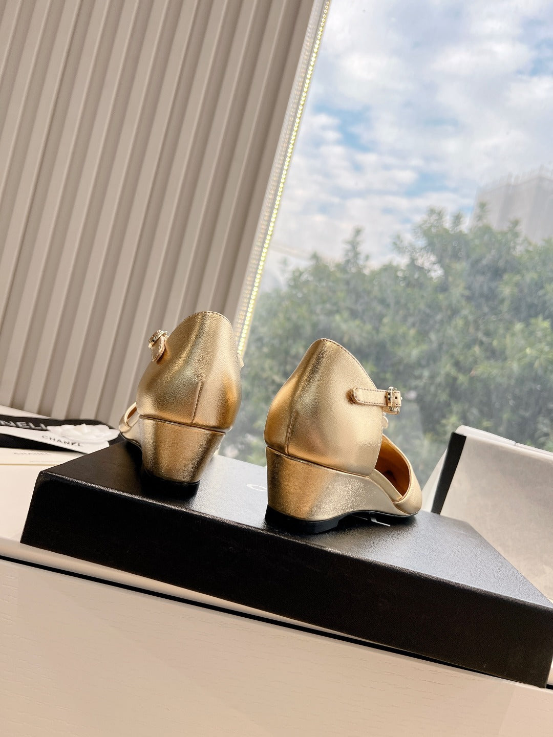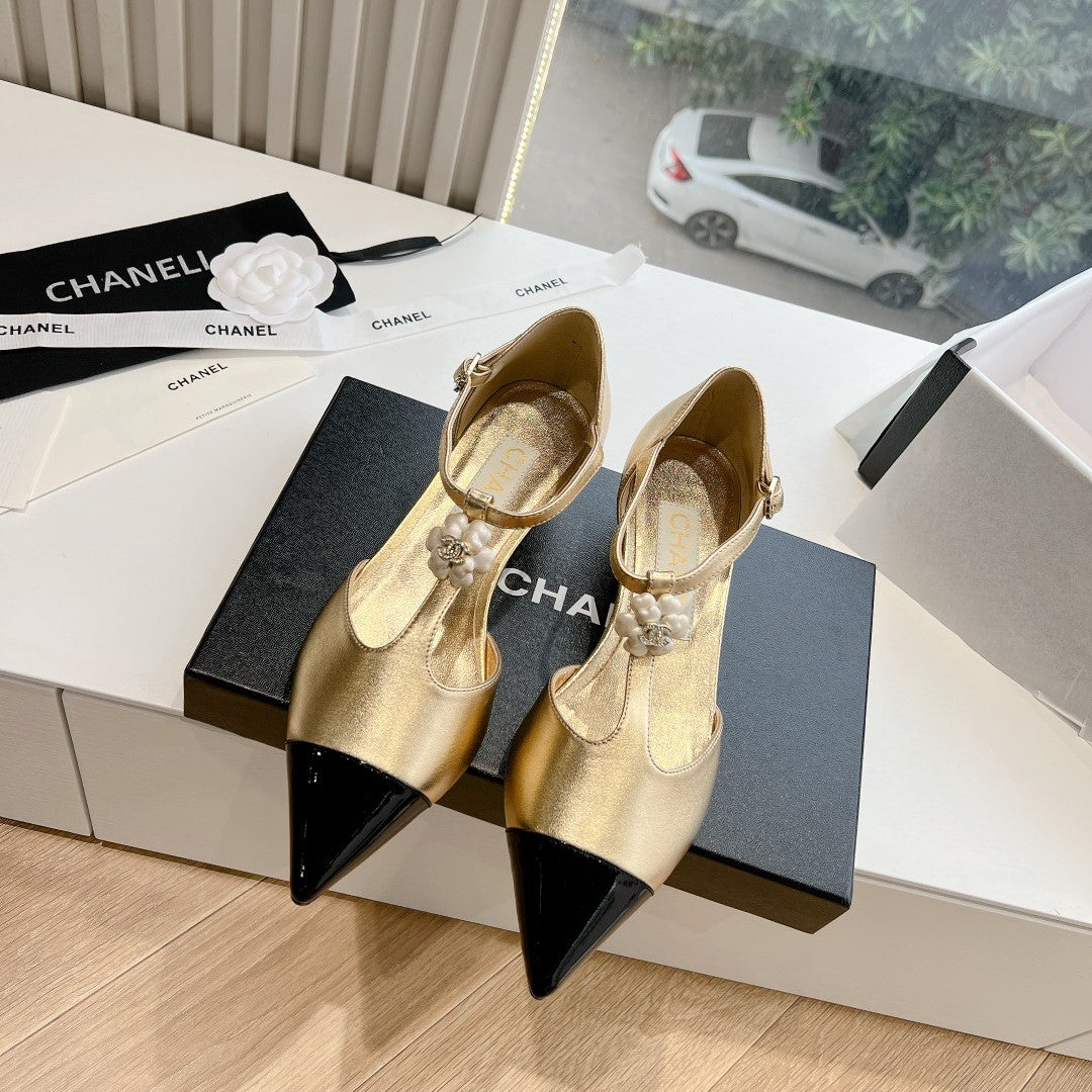 CC 25s Camellia T Strap Slingback 50mm Black Gold Calfskin&Sheepskin 413325