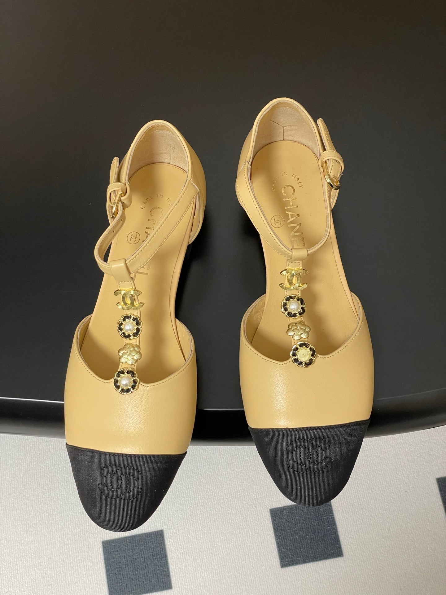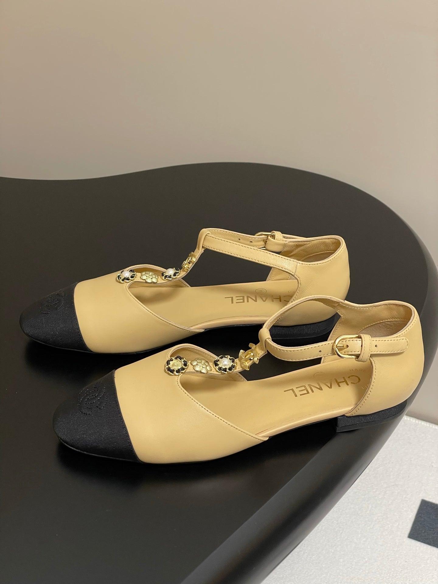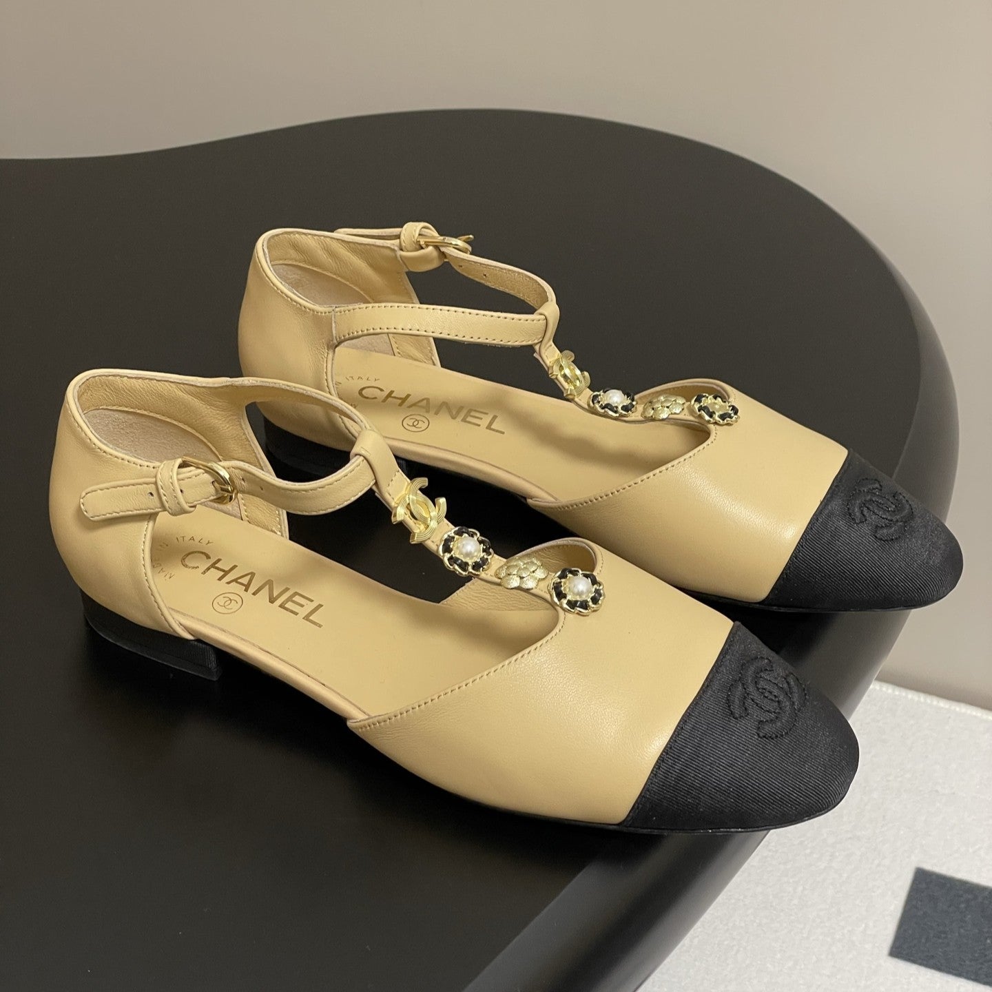 CC 25S Jewelry Double C Buckle T-Strap Mary Jane Beige Lambskin Black Grosgrain 247712