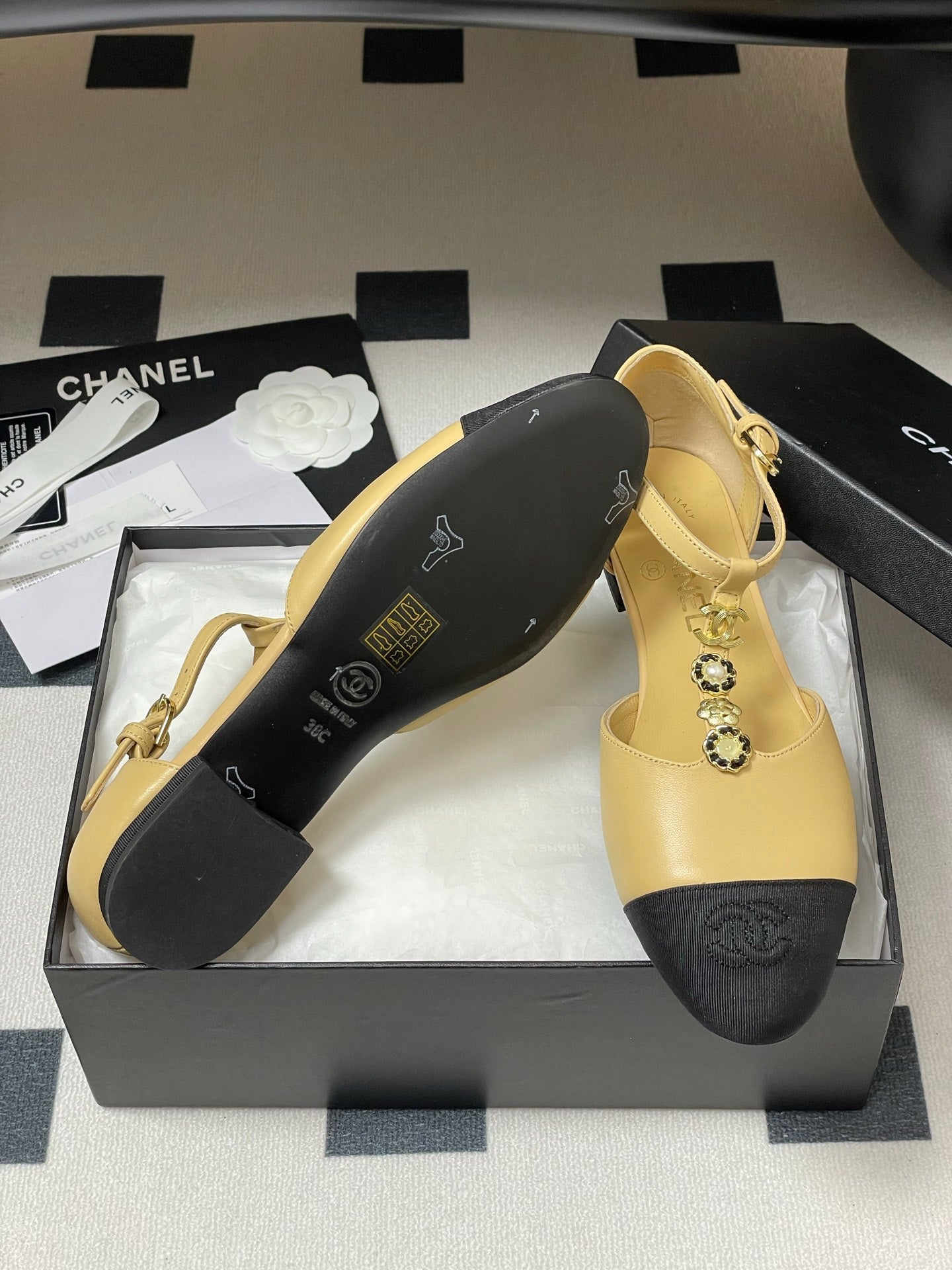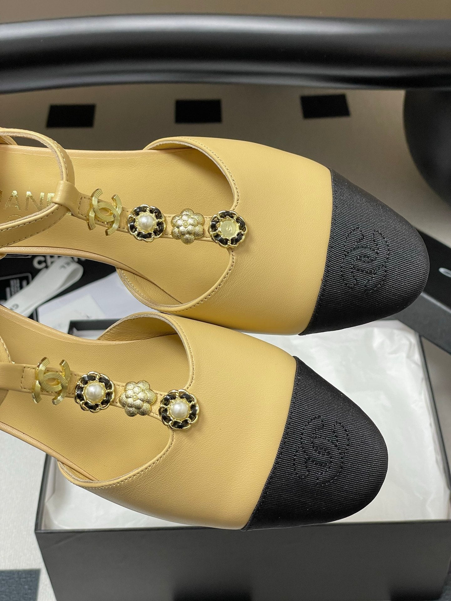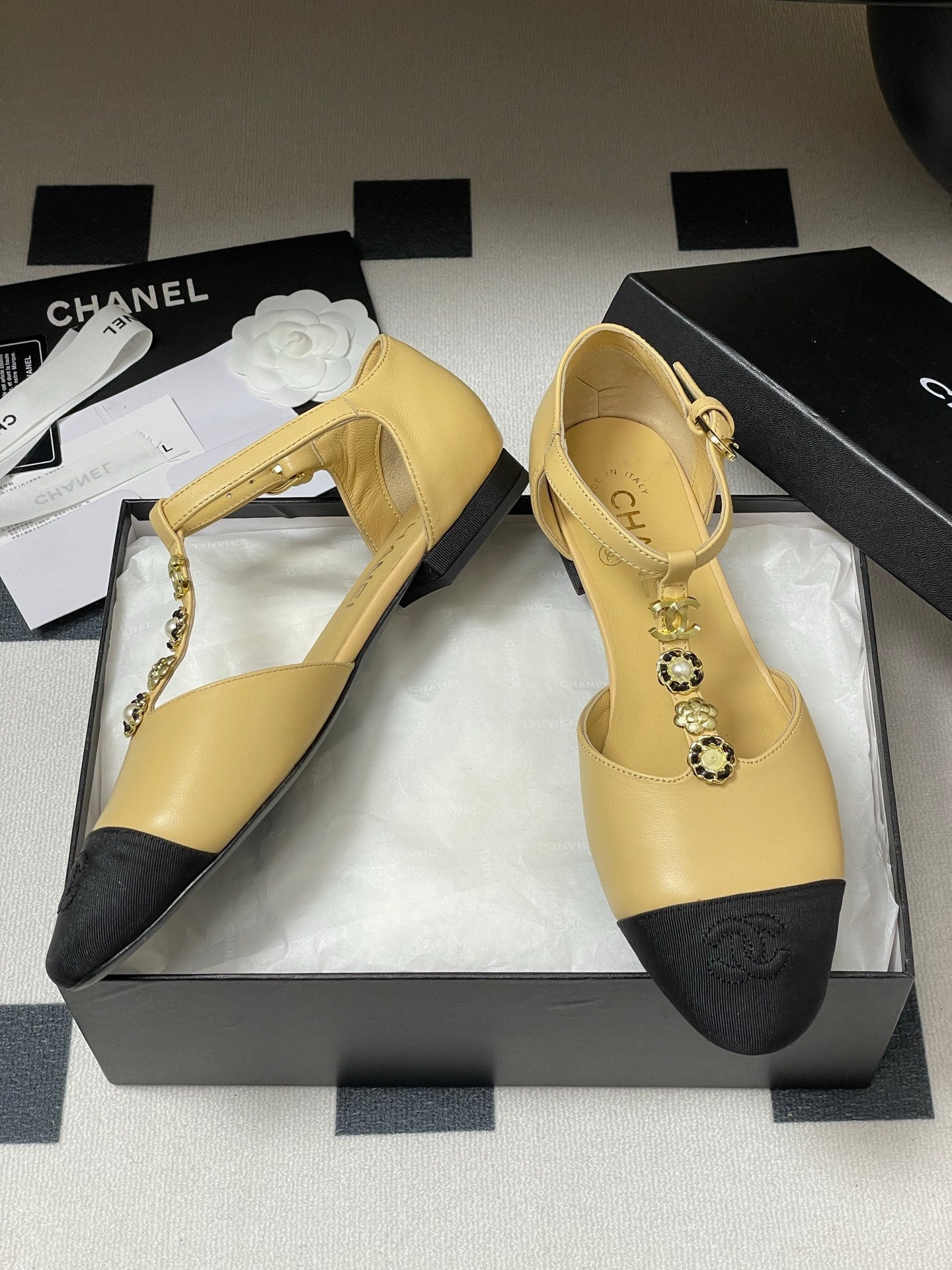 CC 25S Jewelry Double C Buckle T-Strap Mary Jane Beige Lambskin Black Grosgrain 247712
