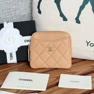 CC Zip Card Holder Wallet Beige Gold Metal Caviar 240603