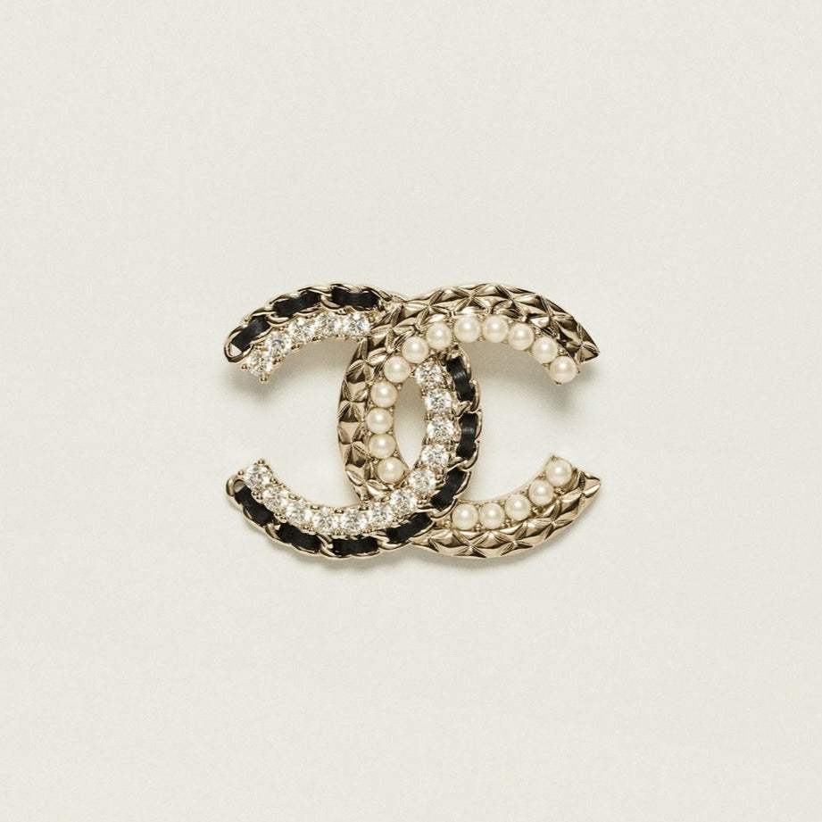 CC Brooch Gold Metal Crystal Pearl and Leather