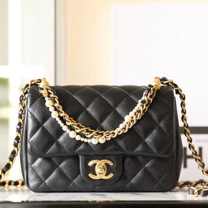 cc 24p mini flap bag 17cm black lambskin pearl chain