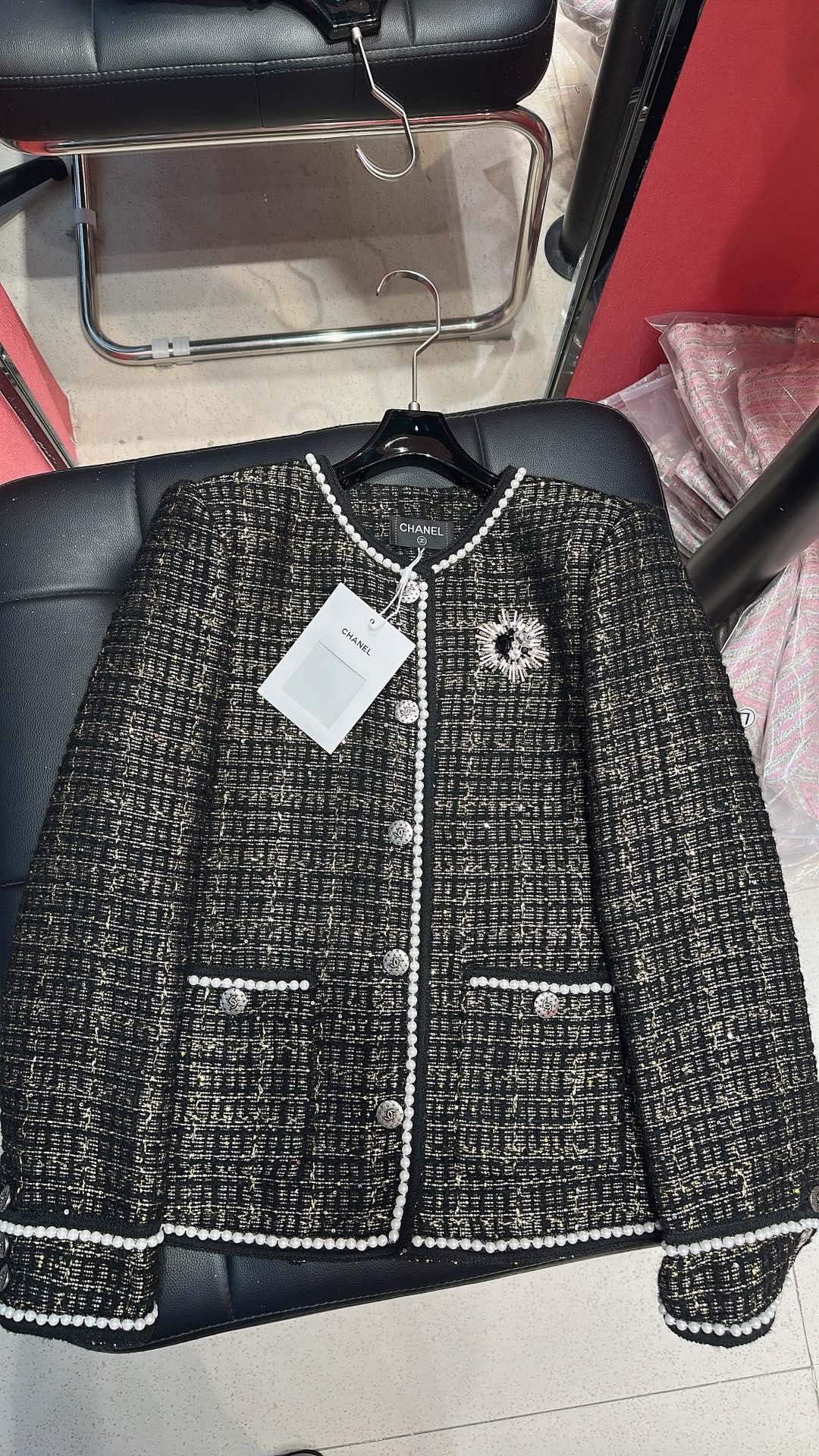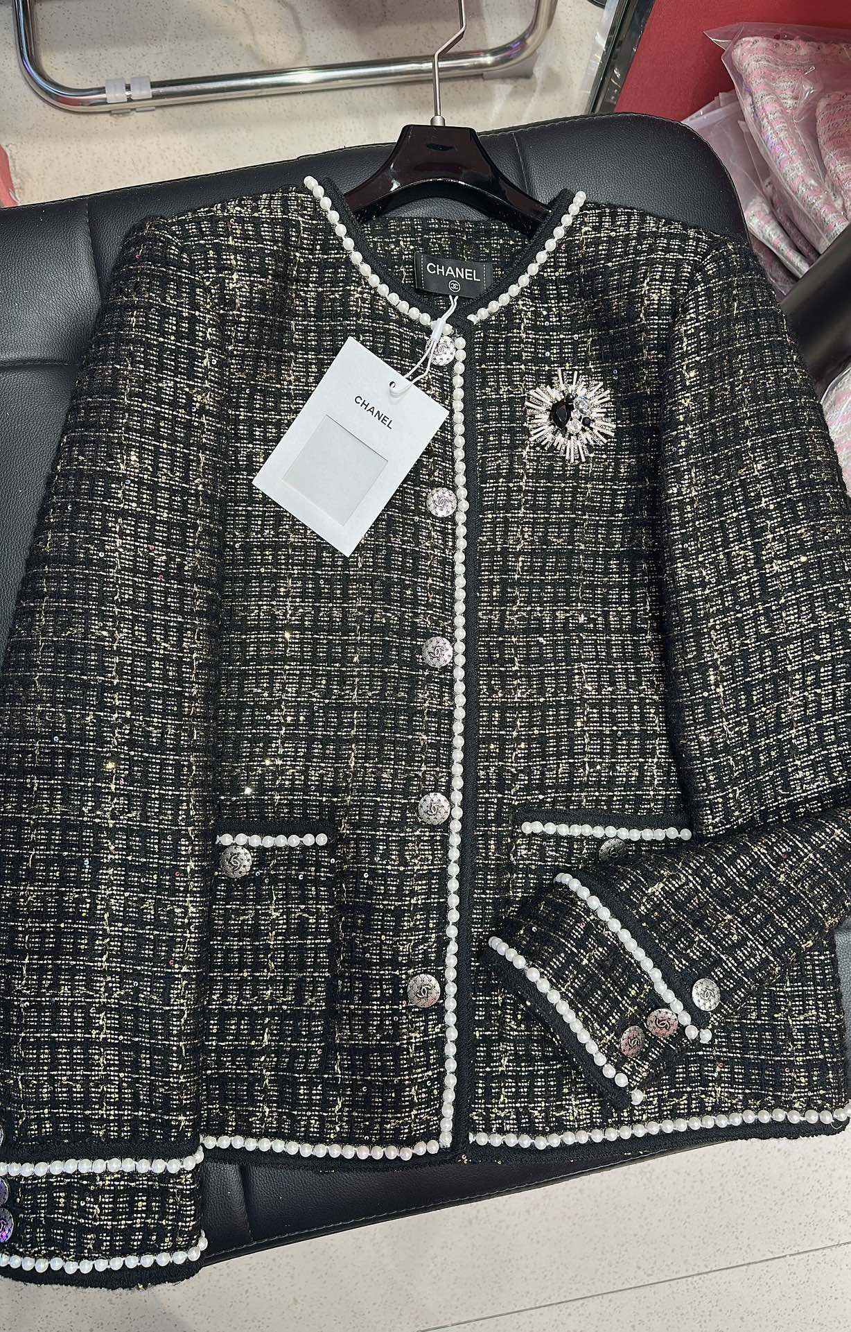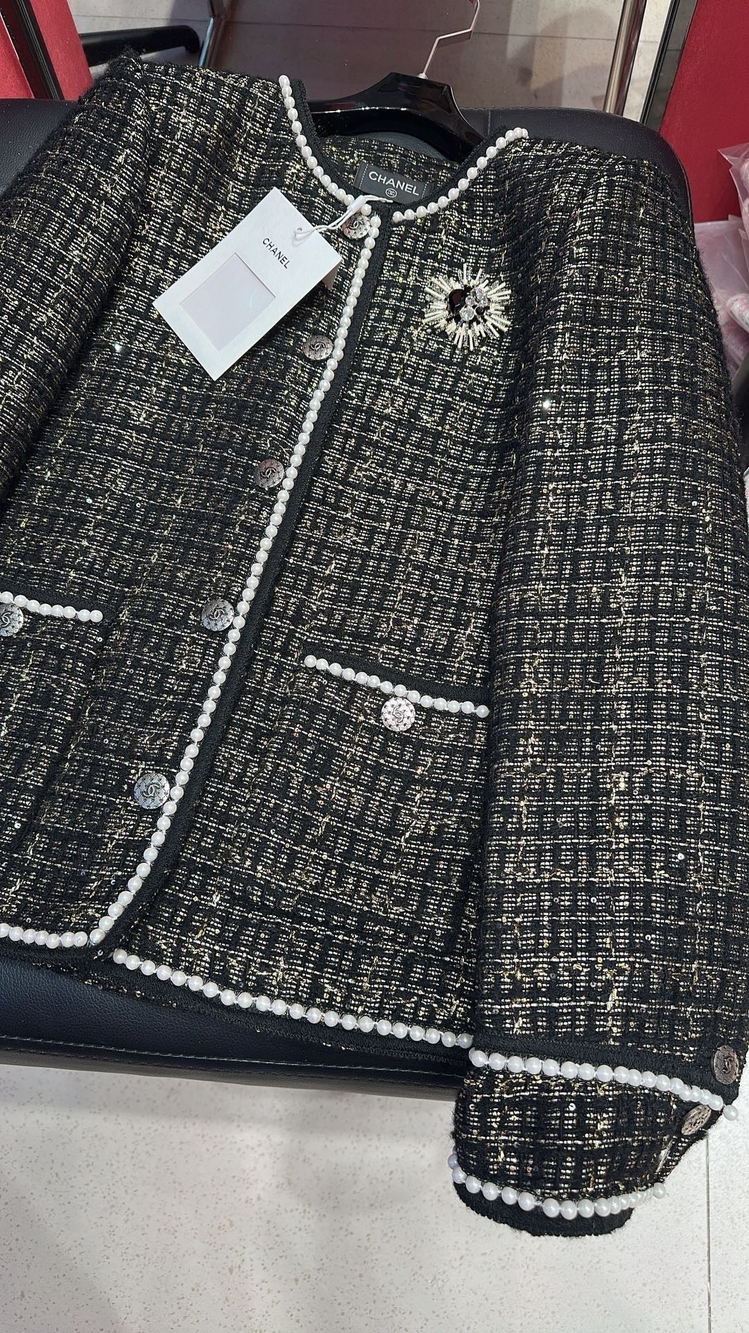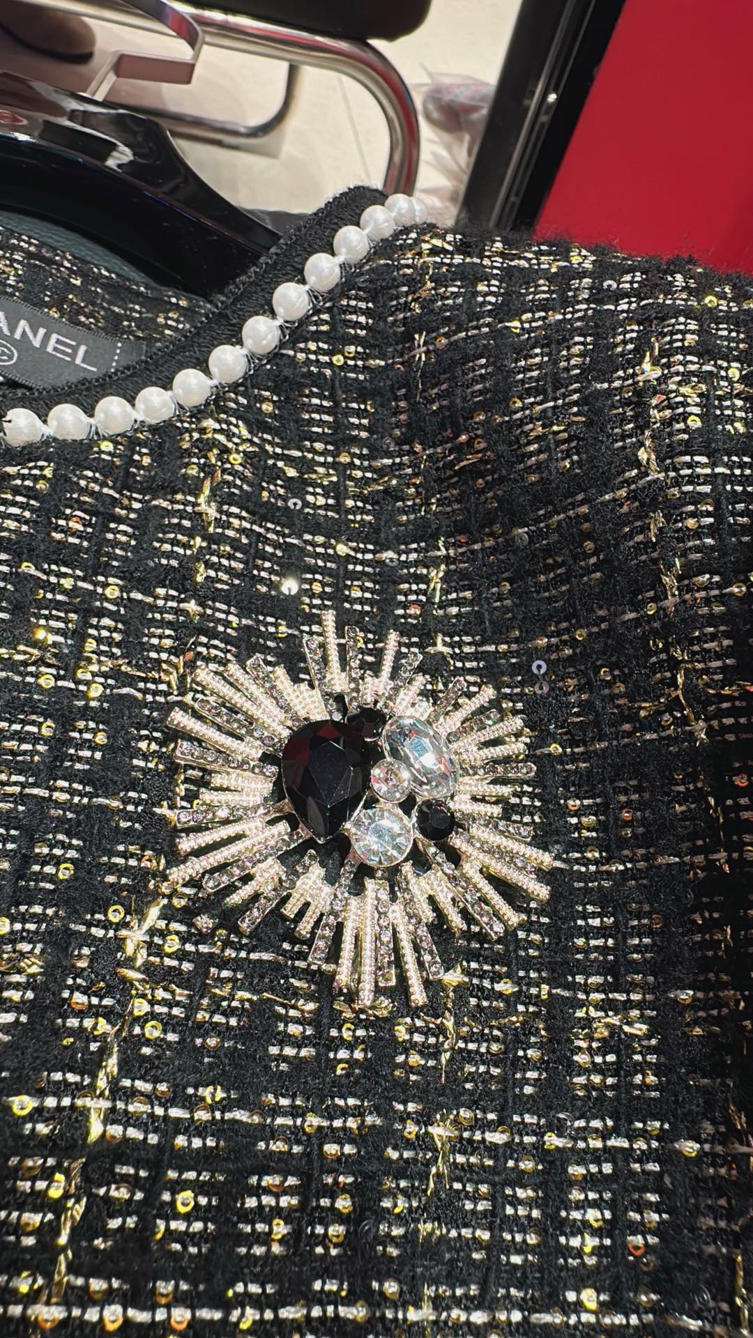 CC 25 Catwalk Style Custom Gold Woven Woolen Pearl Trim Black Coat