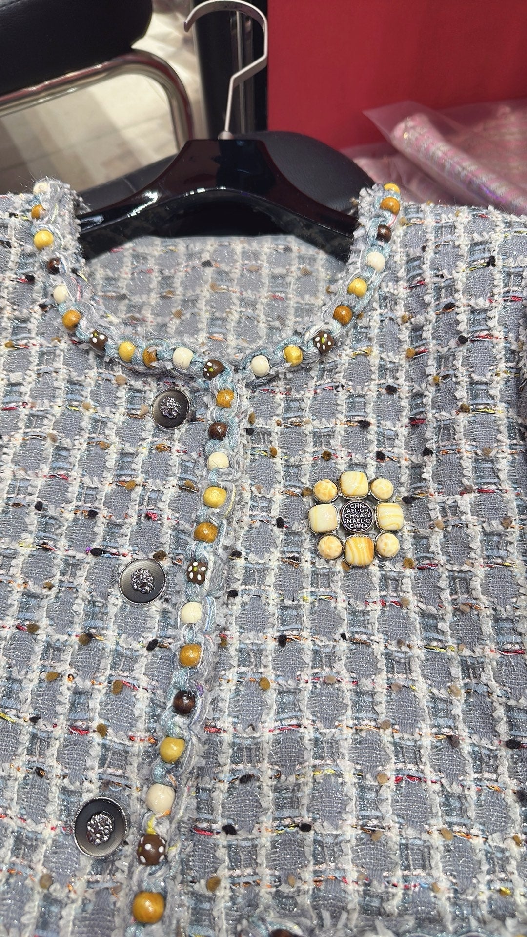 CC 25 Long Sleeves Jacket with Wooden Bead Trim Gray Tweed