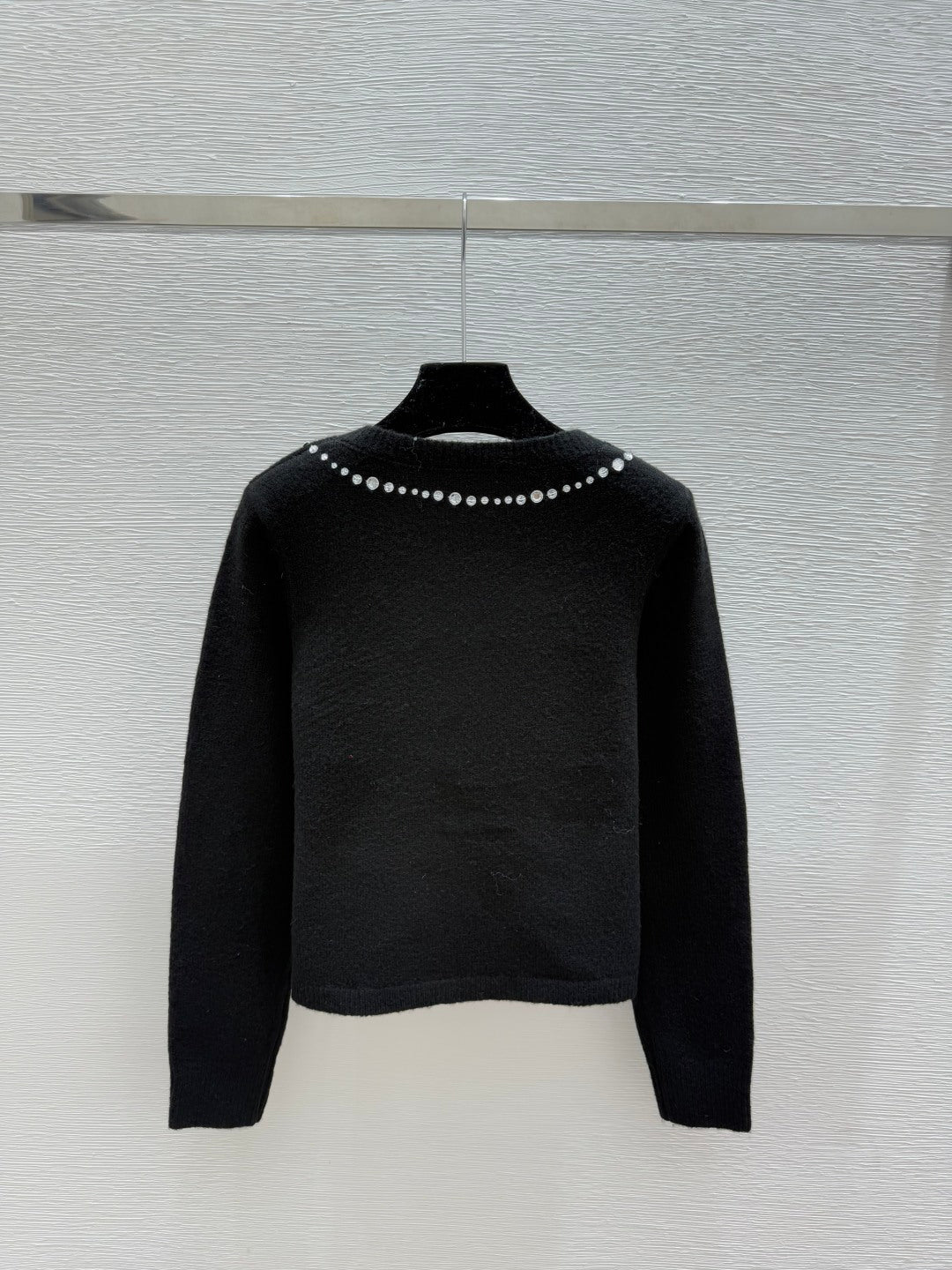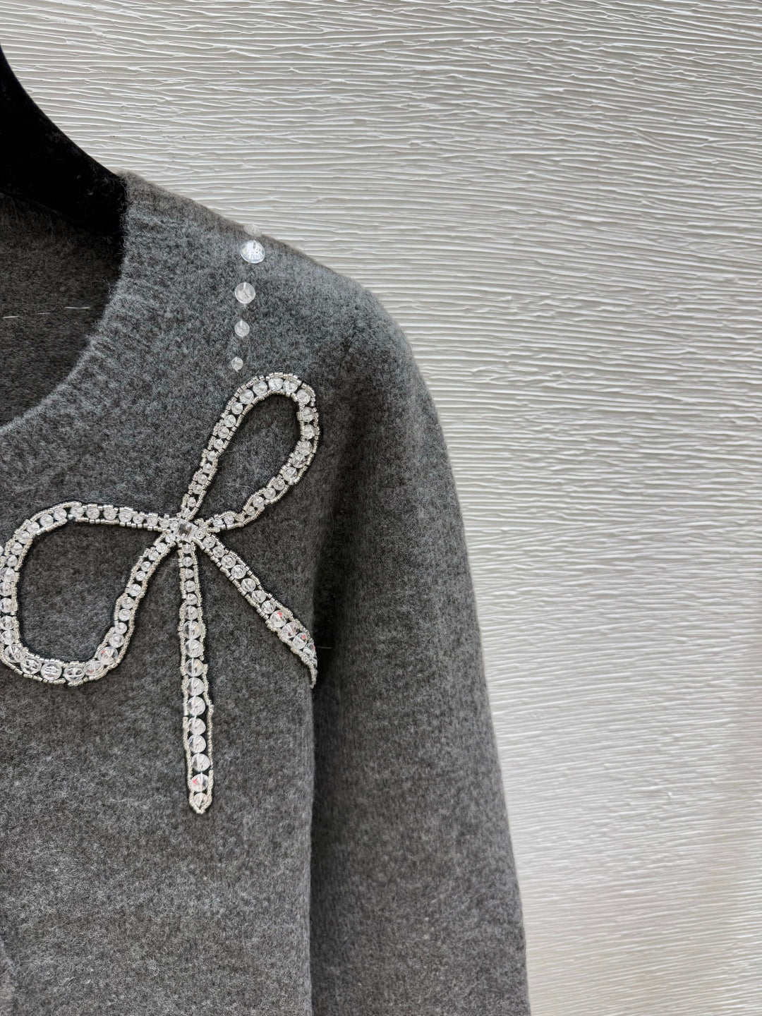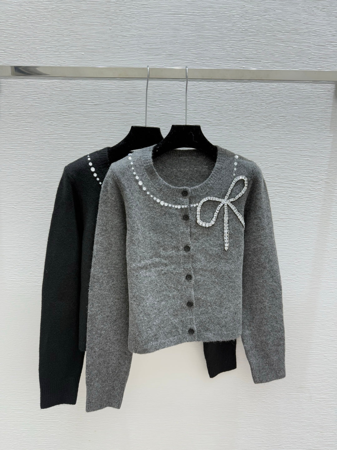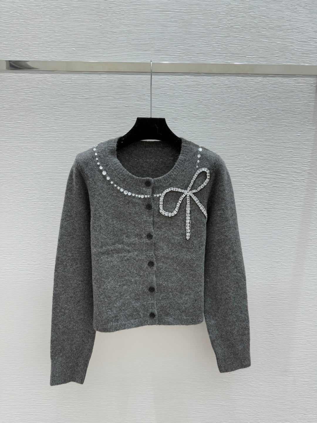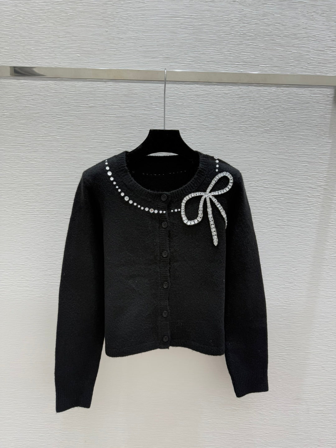 CC 25F Heavy Bow Beaded Round Neck Knit Wool Cashmere Long-Sleeved Cardigan