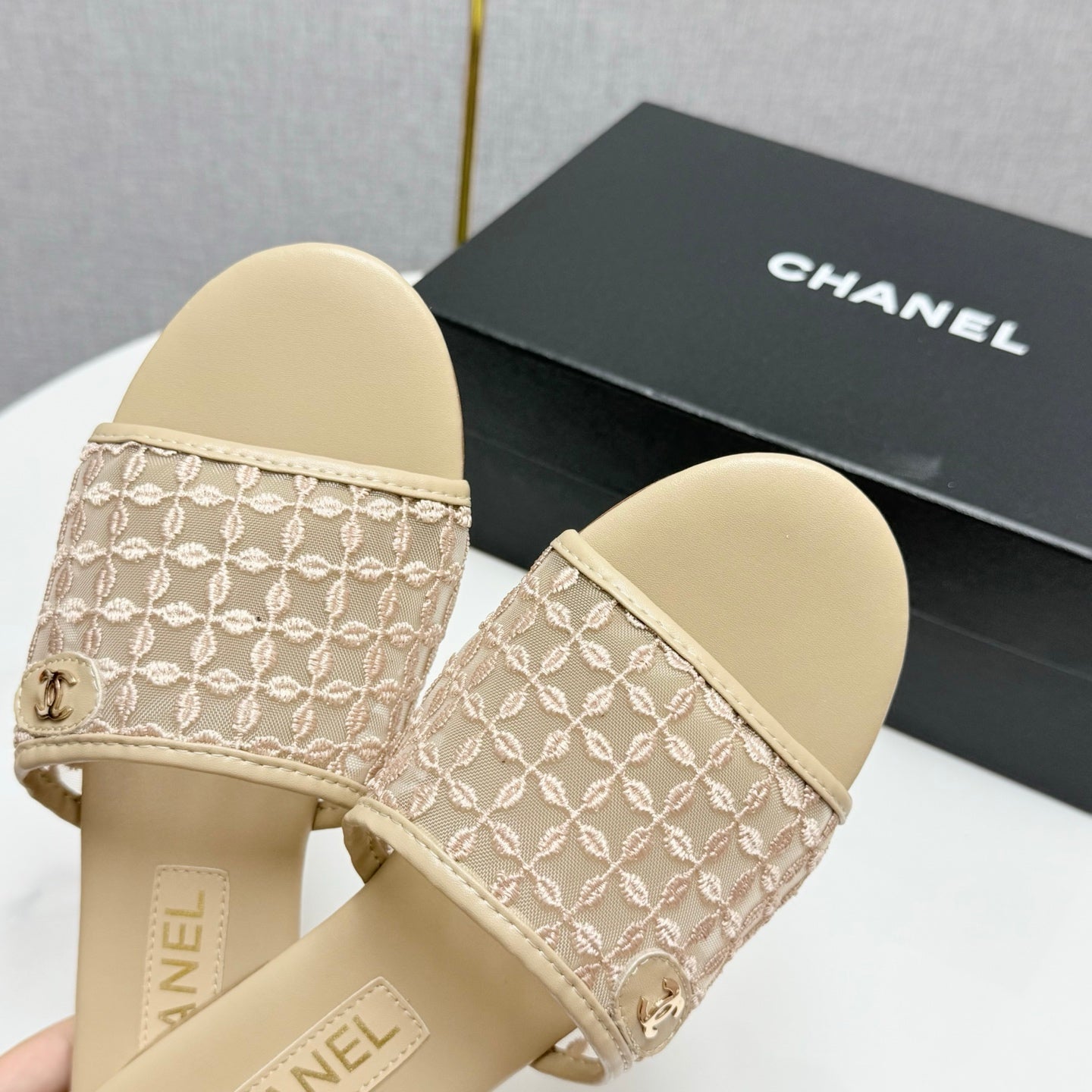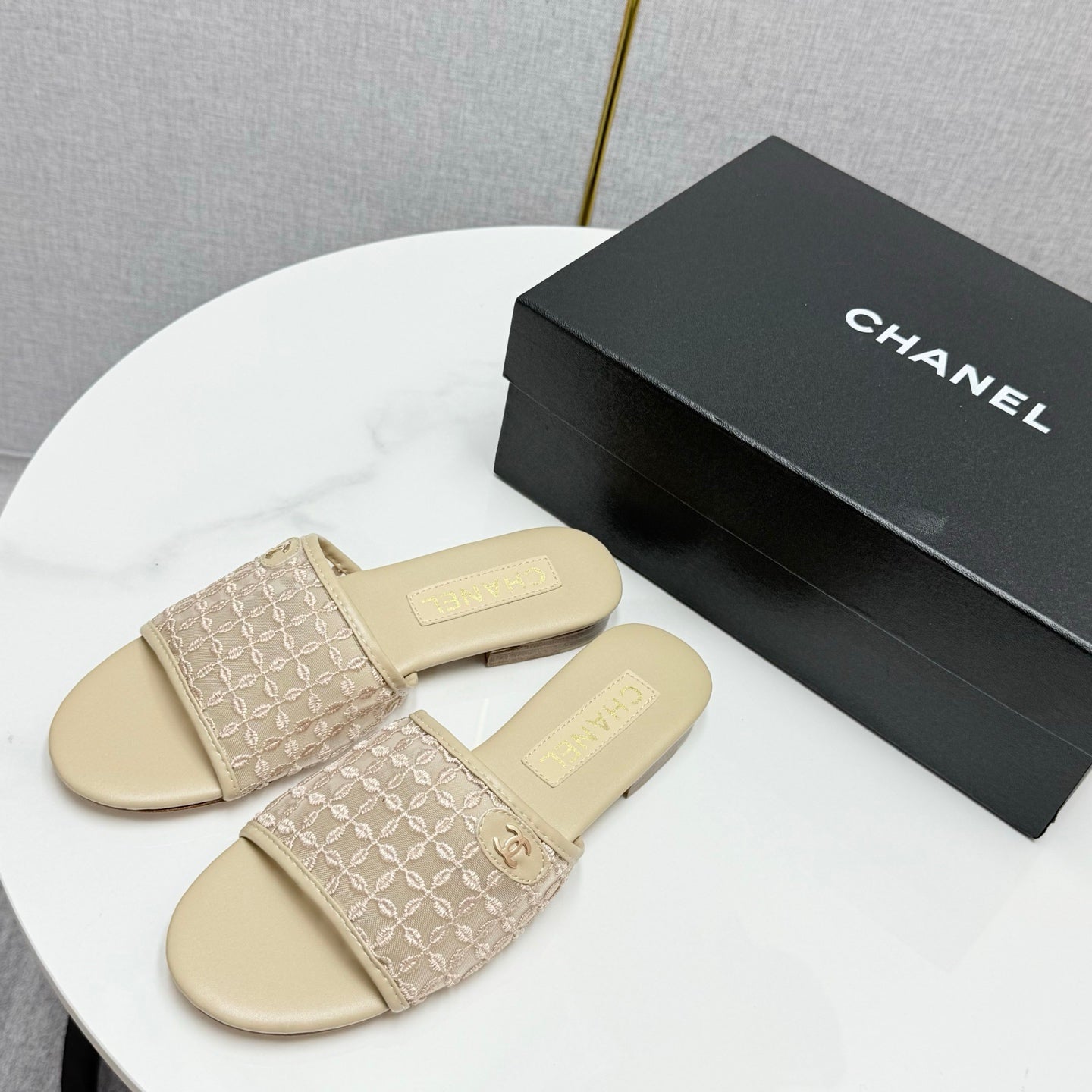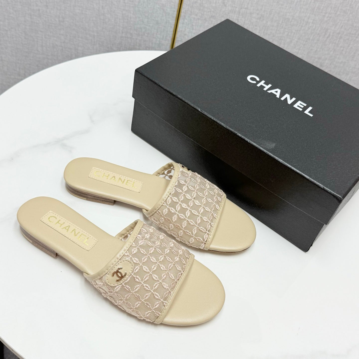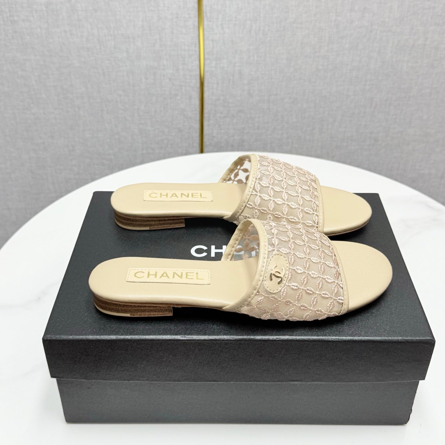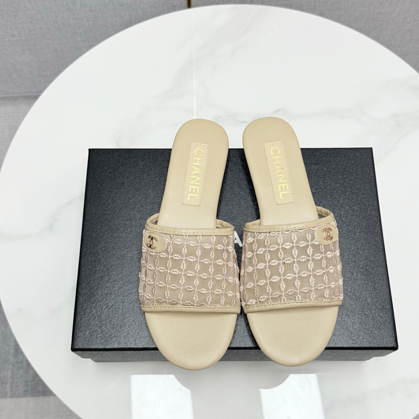 CC 25 Flat Mule Sandals Beige Mesh And Sheepskin 368807