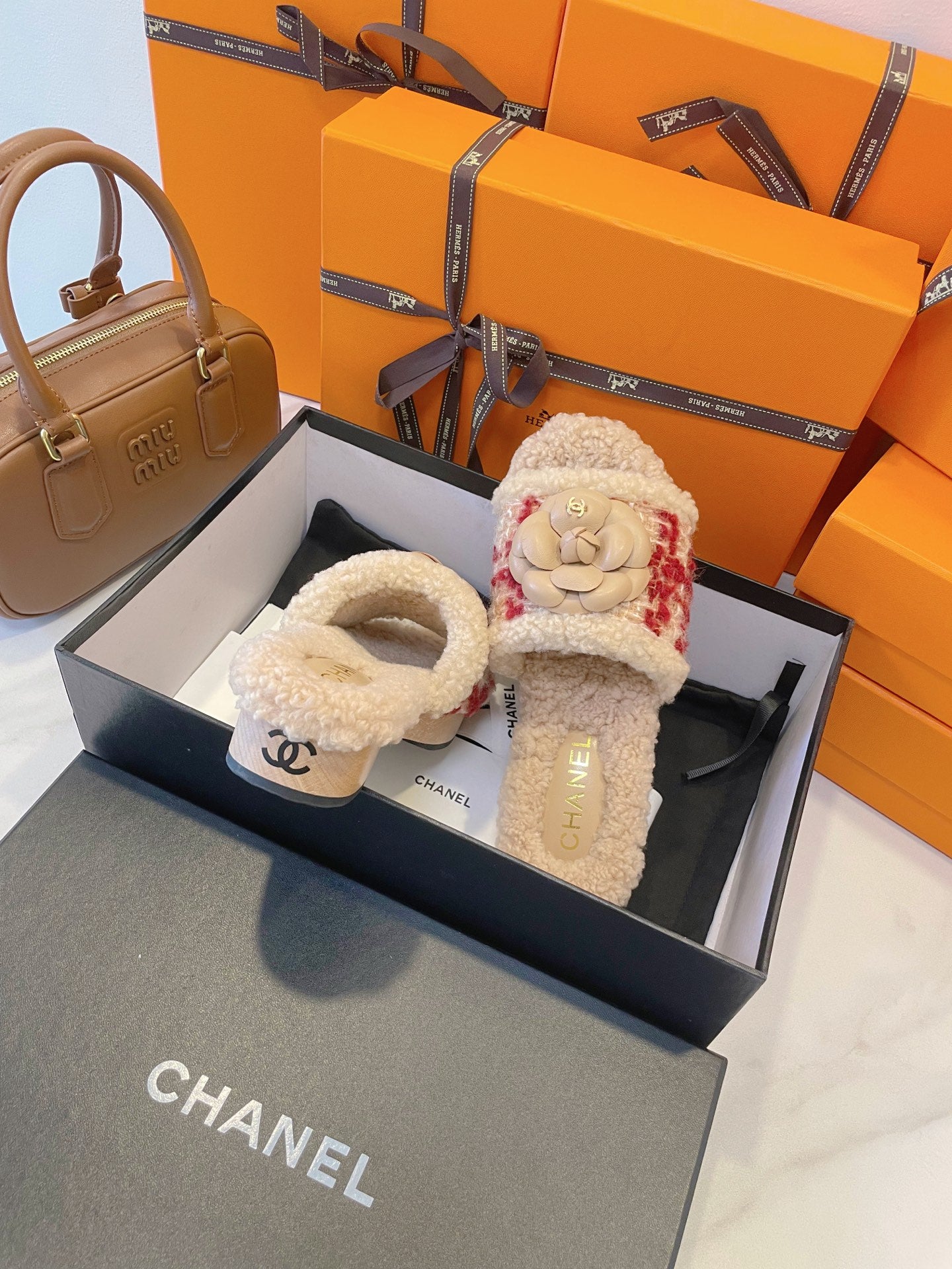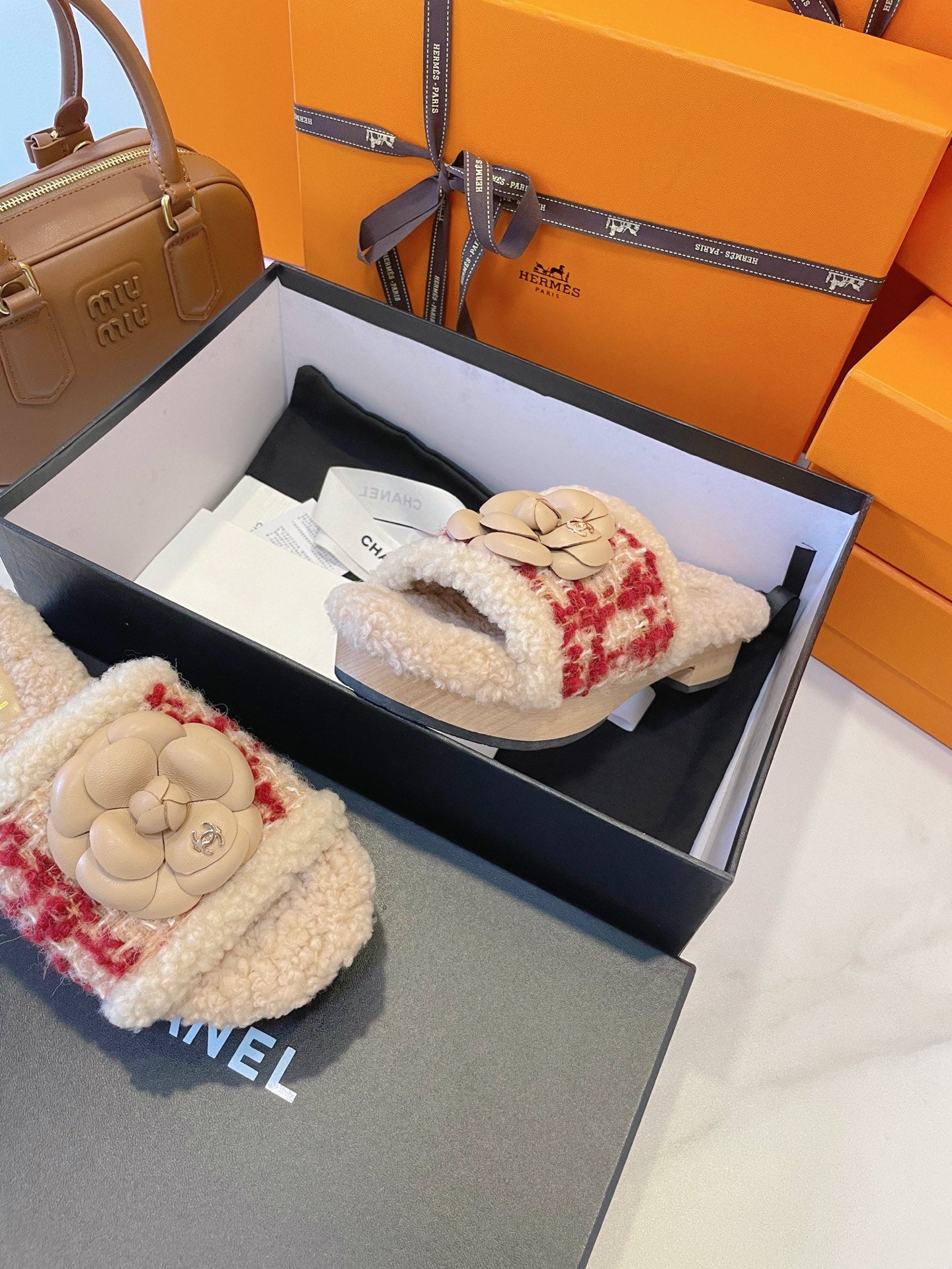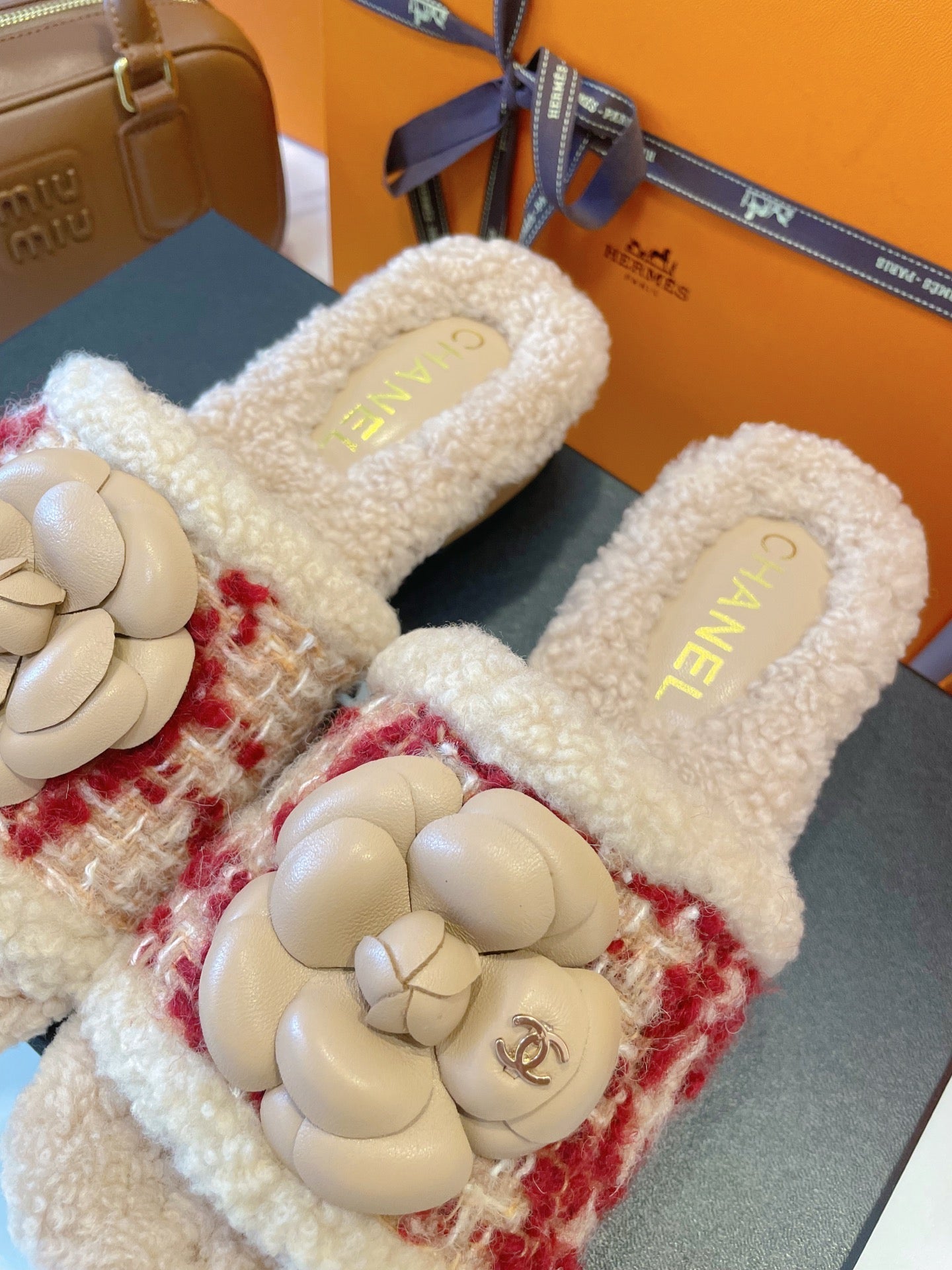 CC 25C Logo Slippers 50mm Multicolor Shearling Wood Sheepskin 423694