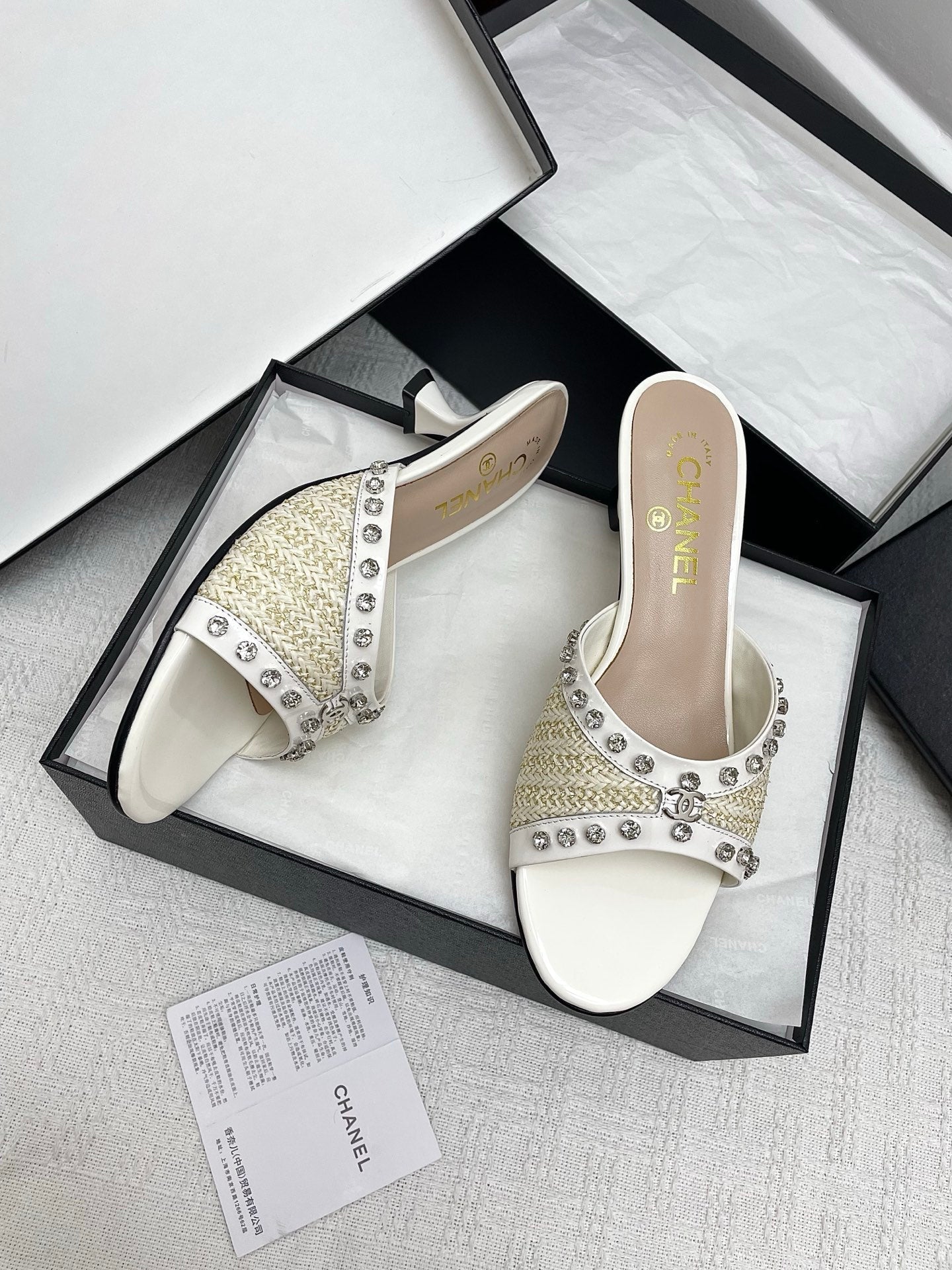 CC 25SS Slippers 5cm Light Yellow Raffia White Patent Calfskin 338301