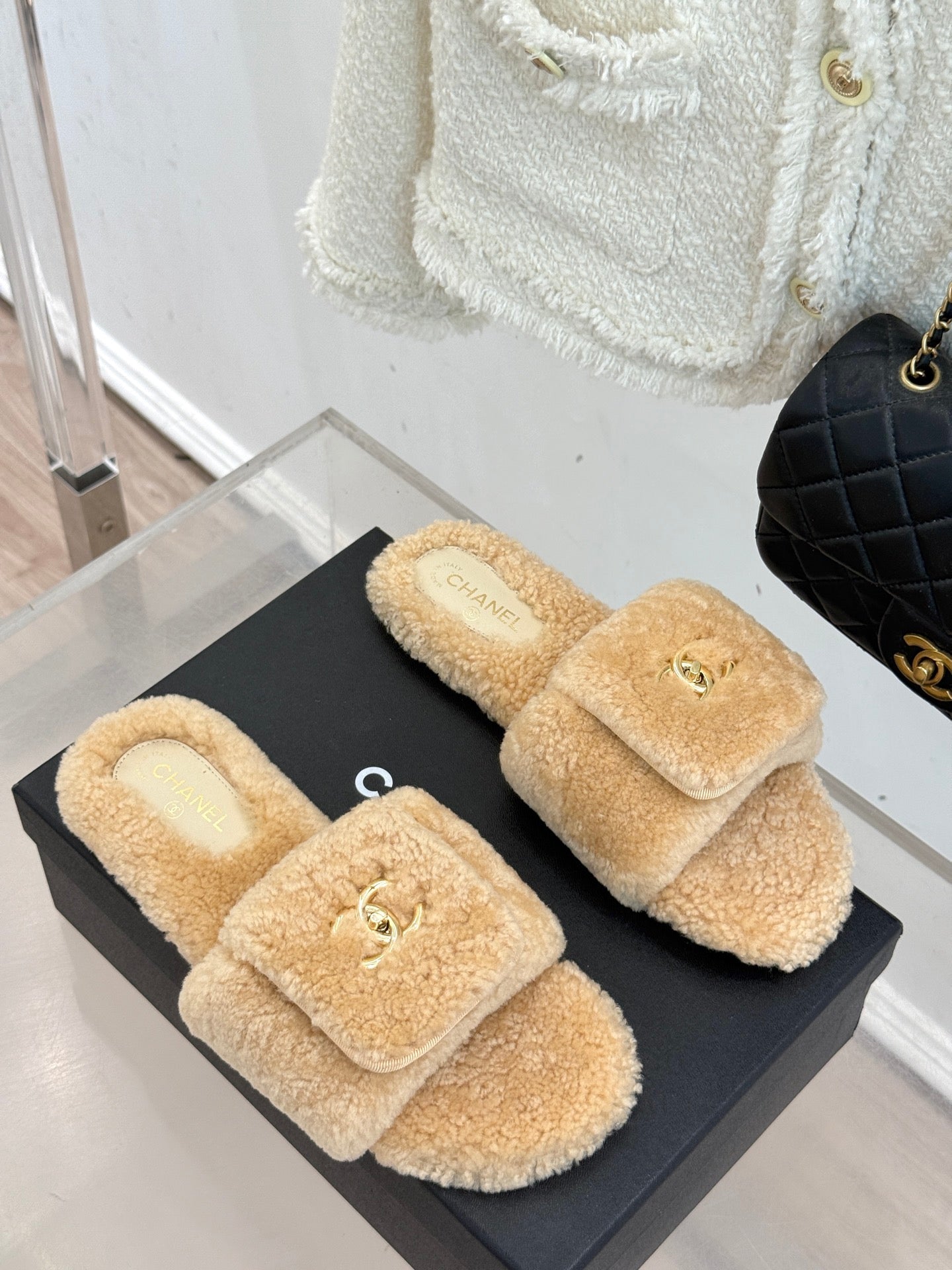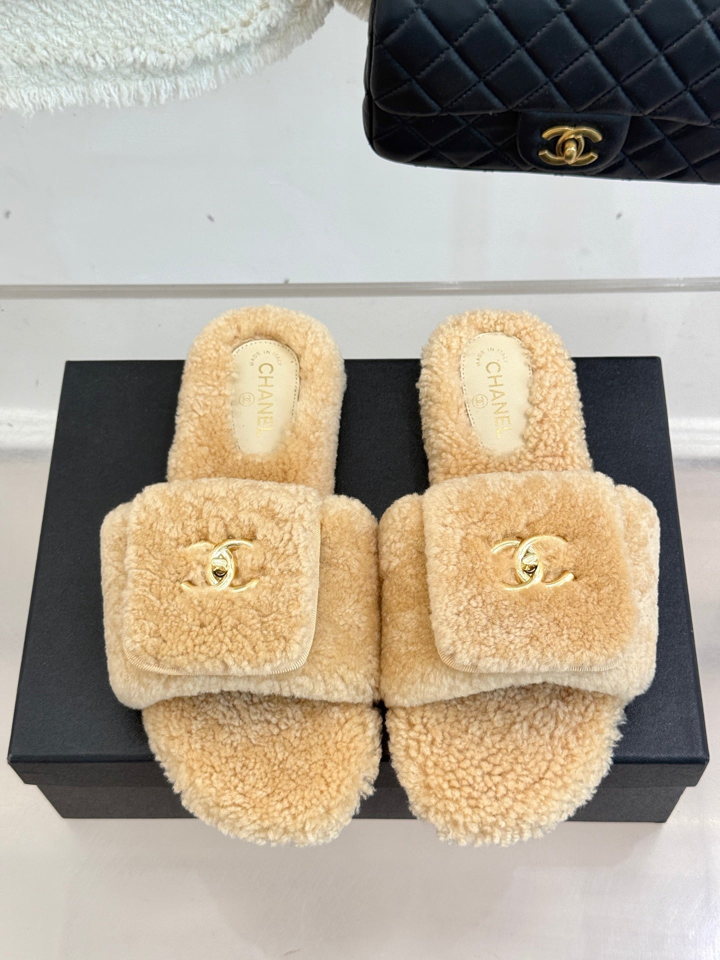 Chanel 25 Buckle Flip-up Thick-soled Slippers Beige Wool 465382