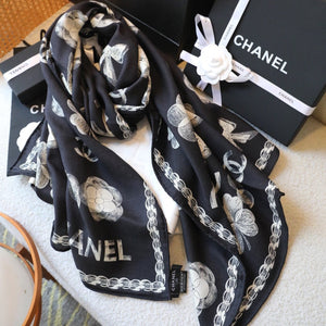SCARF 180 CM IN BLACK FLOWER MONOGRAM SILK AND CASHMERE 401134