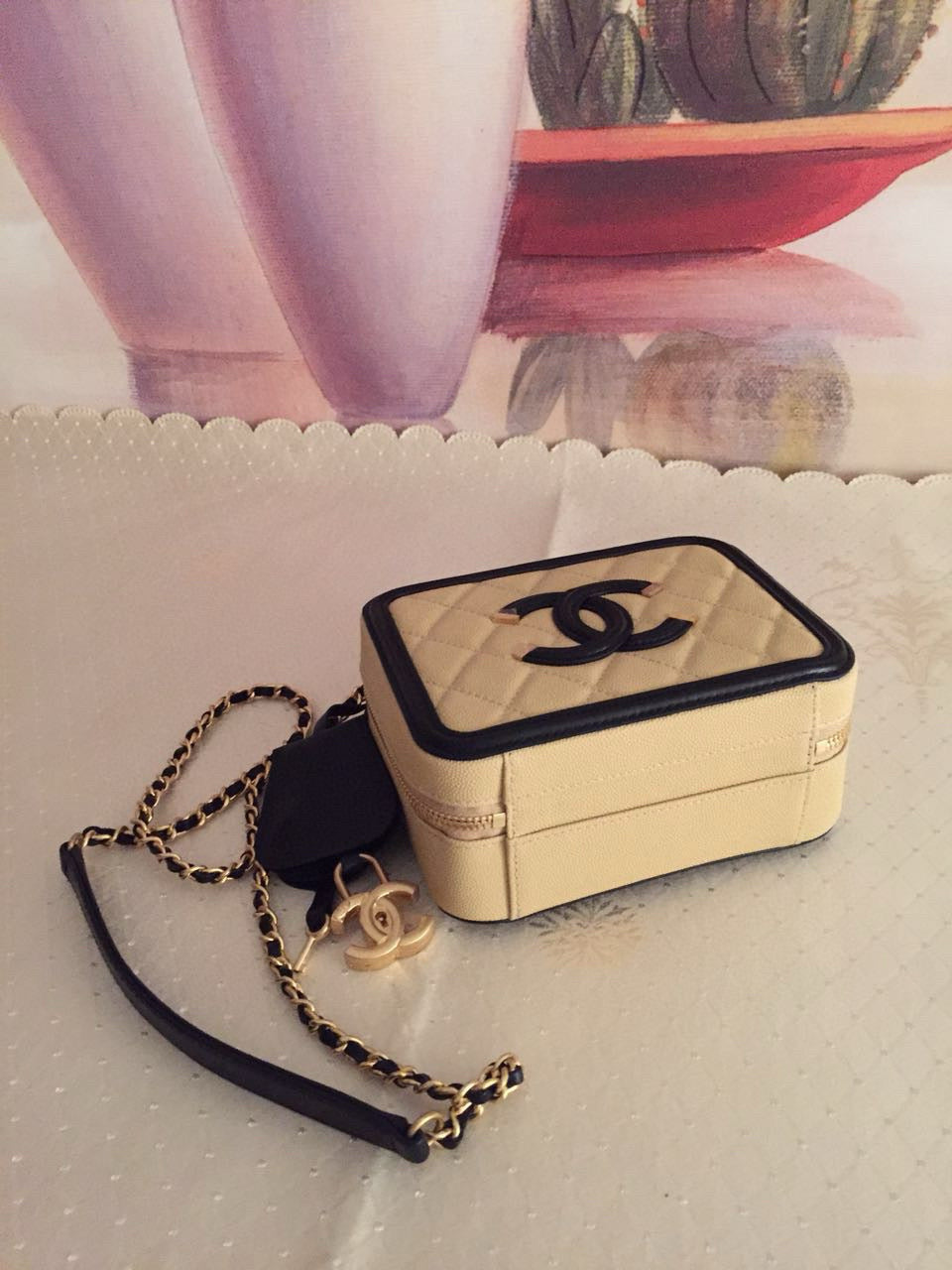 CC Filigree Vanity Case Bag Black Beige Quilted Caviar Leather