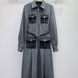 CD 25SS Lapel Middle Zipper Guilted Four Pockets Contrast Color Dress Gray Wool 304163