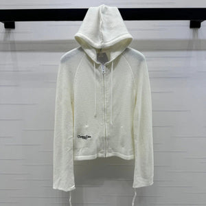CD Feather-embellished Hooded Knit Long-sleeved Cardigan with Back Lettering
