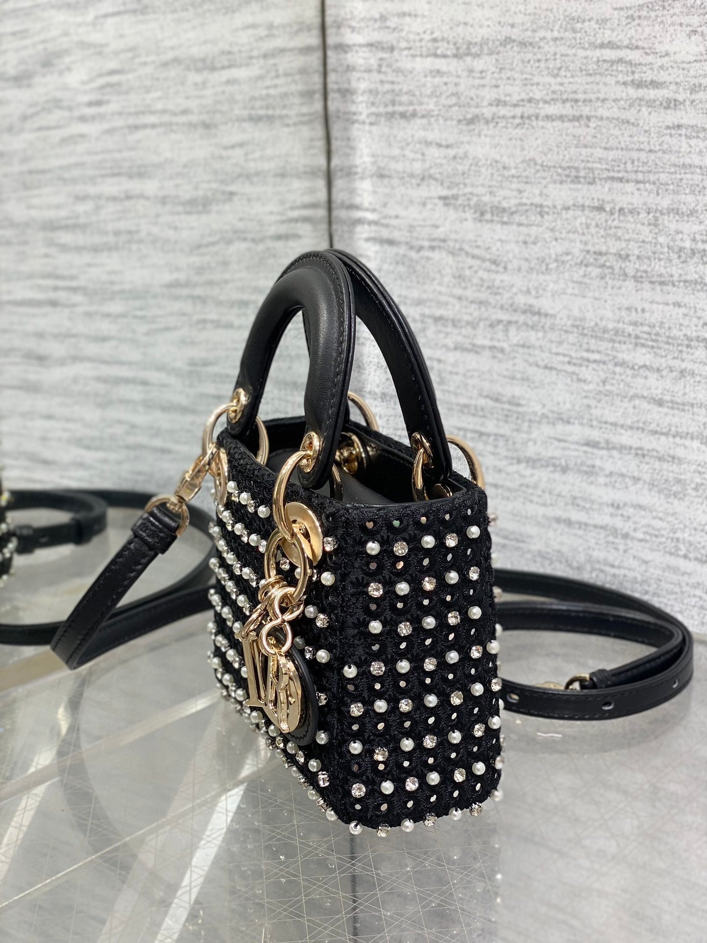 Lady Micro Bag 10cm Black Canvas Diamond Pearl
