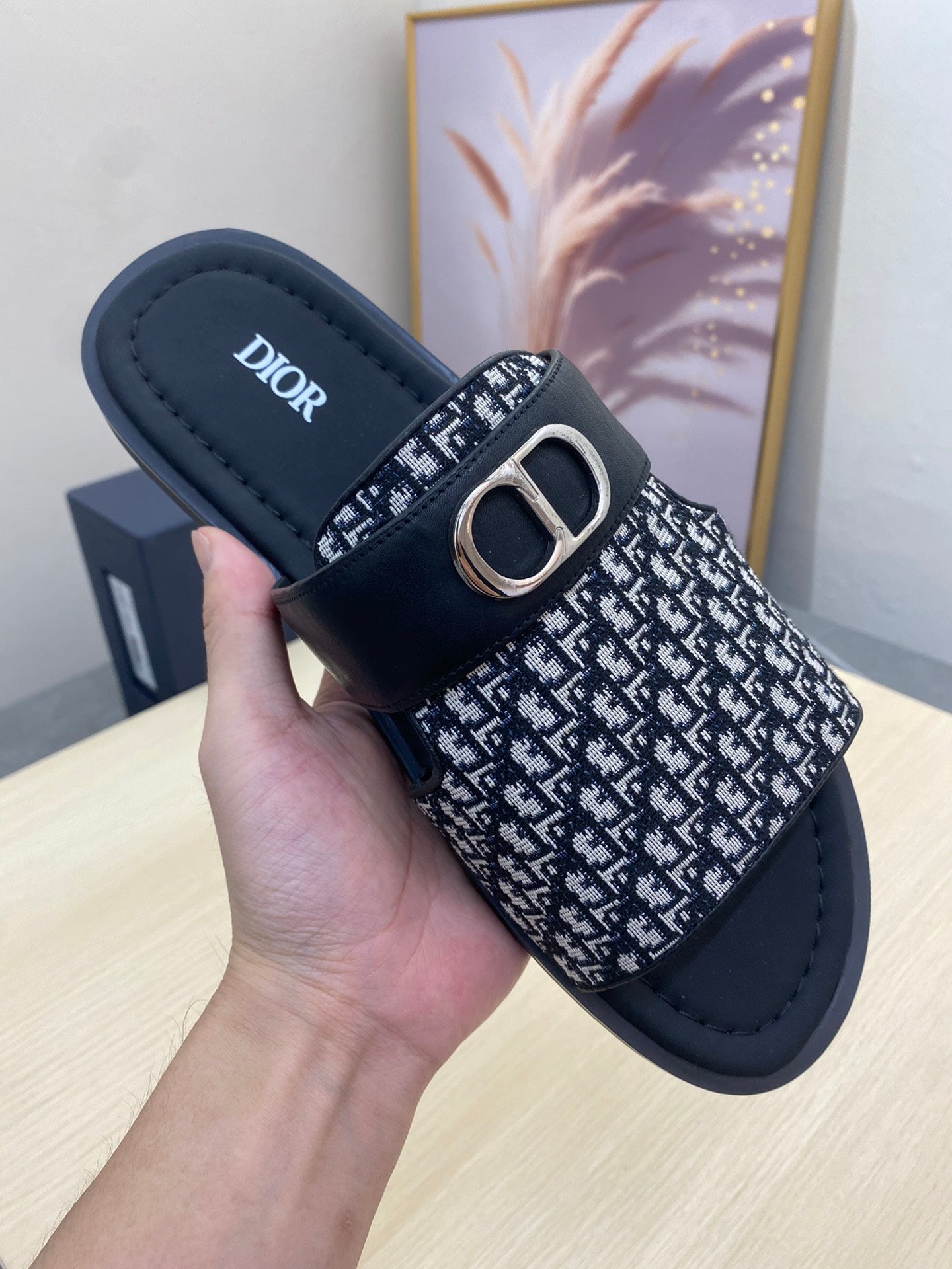 CD SYMBOL SLIDE CUT SANDAL BLACK AND WHITE JACQUARD