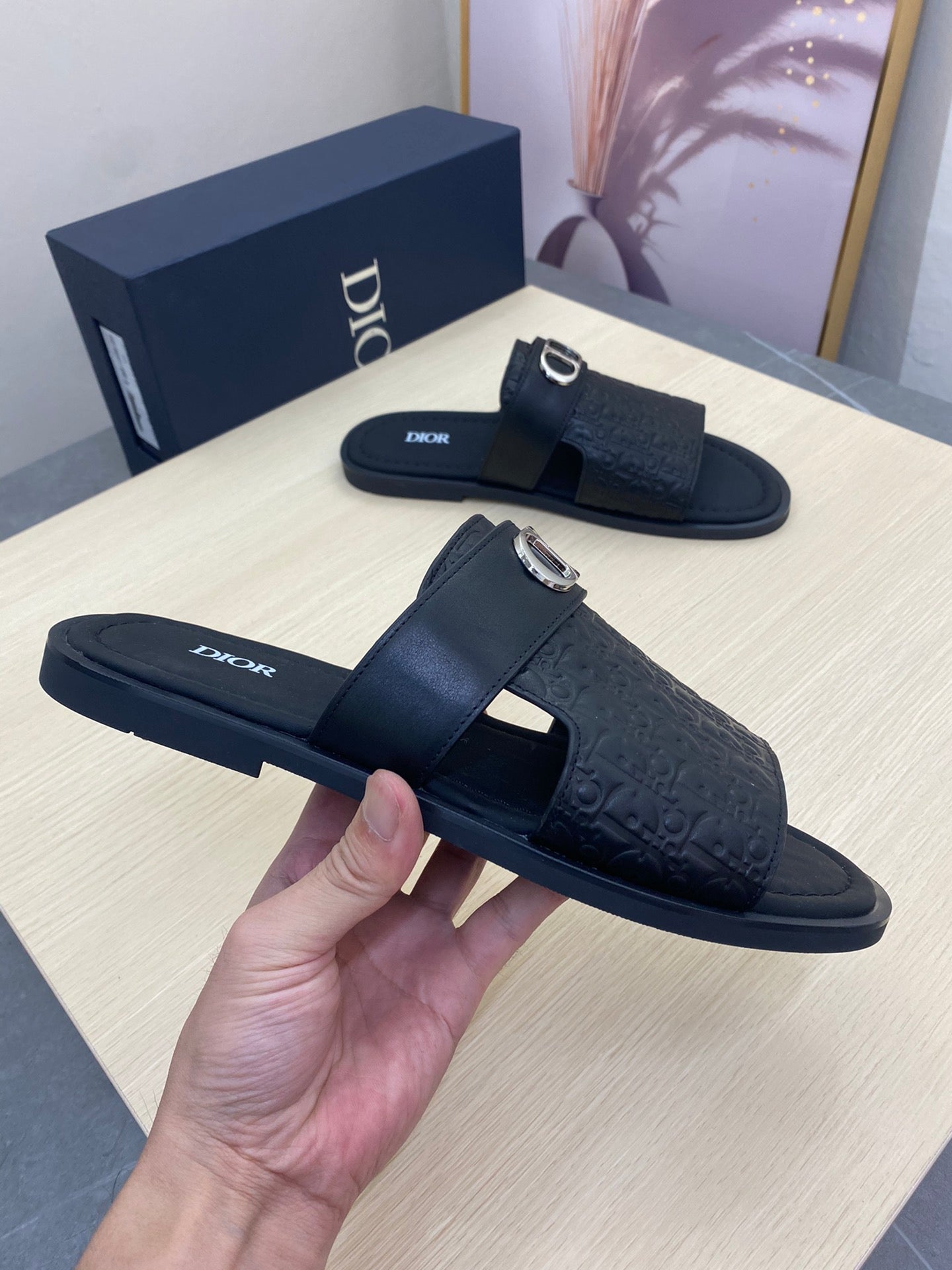 CD SYMBOL SLIDE CUT SANDAL BLACK CALSKIN