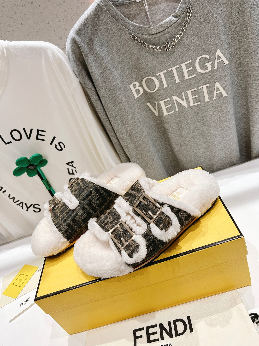 FENDI DAD SANDAL MULE IN BROWN MONOGRAM FF CANVAS WITH WHITE FLEECE