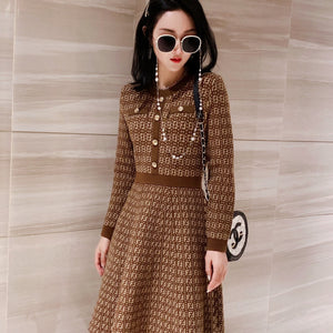 Fendi FF Logo Long Sleeve Jacquard Brown Fabric Wool Dress