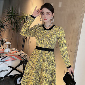 Fendi FF Logo Long Sleeve Jacquard Round Collar Yellow Fabric Dress