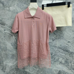 Fendi 25SS Polo Collar Lace Hem Soft Pink Cashmere Shirt